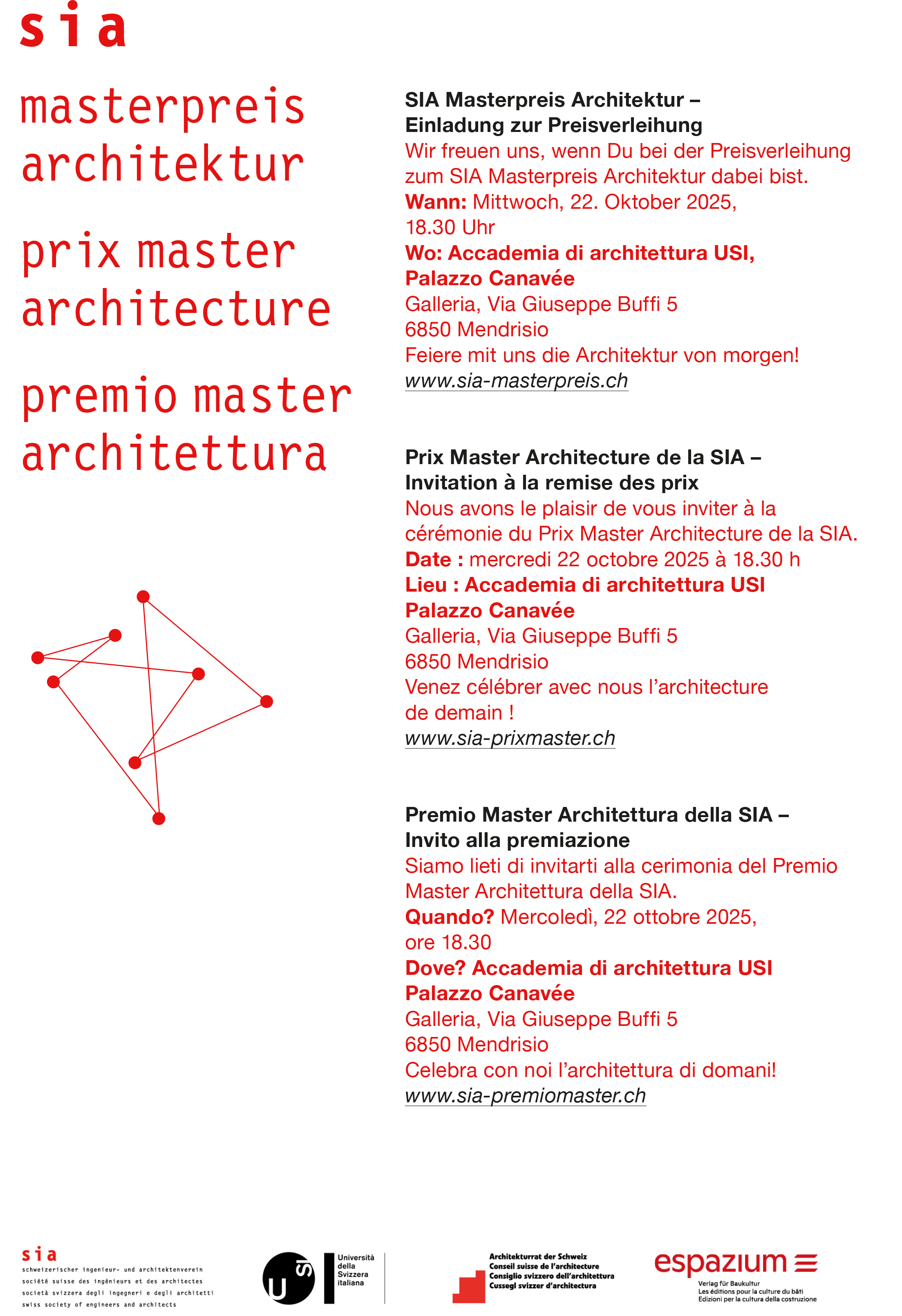 Die Preisverleihung der SIA MAsterarbeiten findet am 22. Oktober um 18.30 in Mendrisio statt.