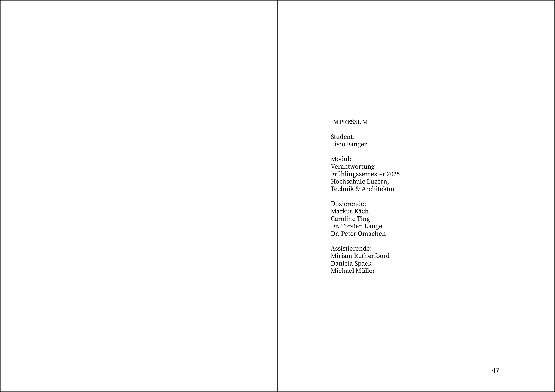 Im Modul «Verantwortung» (Modulverantwortung: Markus Käch) erforschen die Studierenden die gebaute Umgebung nach gesellschaftlichen und kulturellen Zusammenhängen und erstellen einen Foto-Essay zu einem frei gewählten Ort.