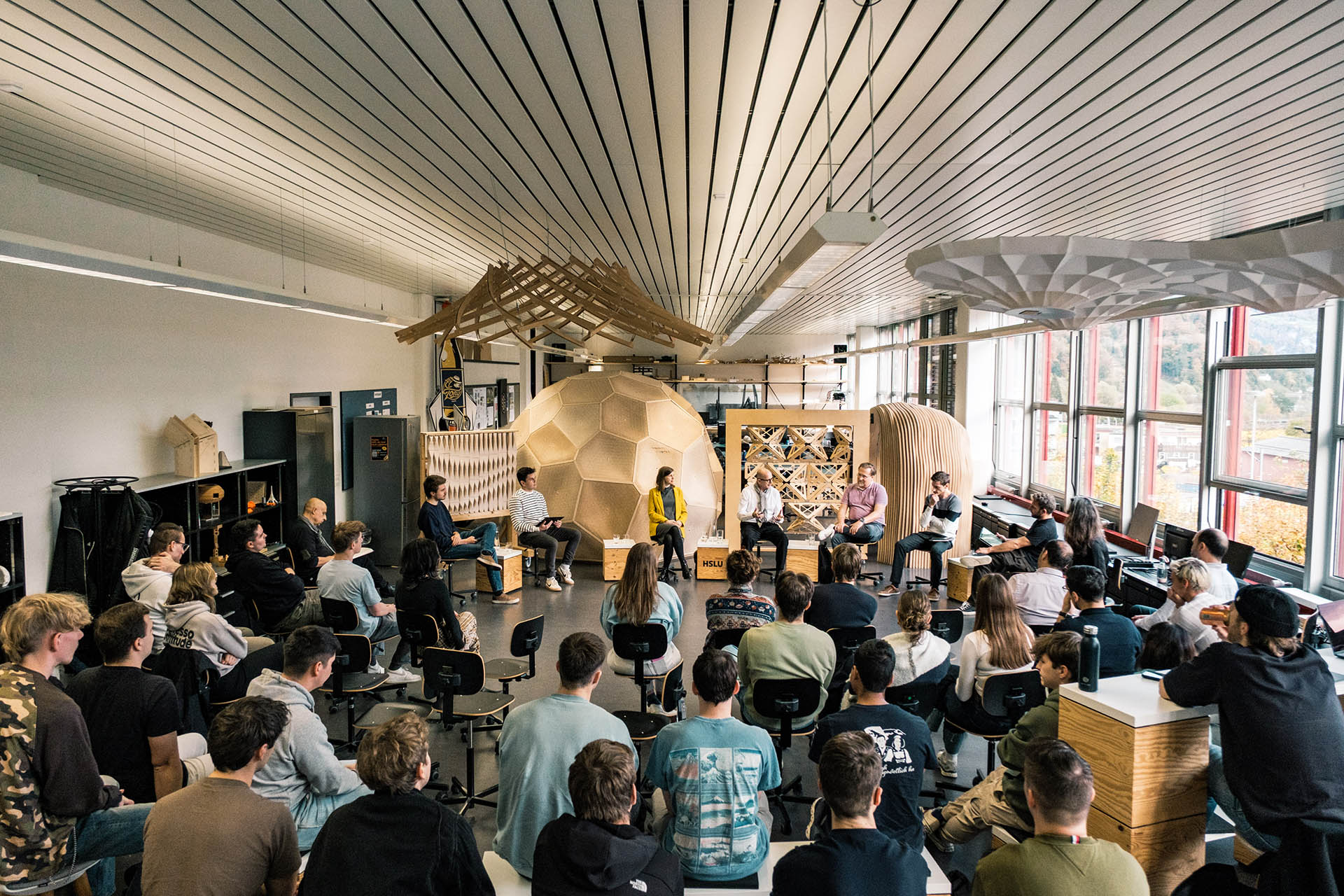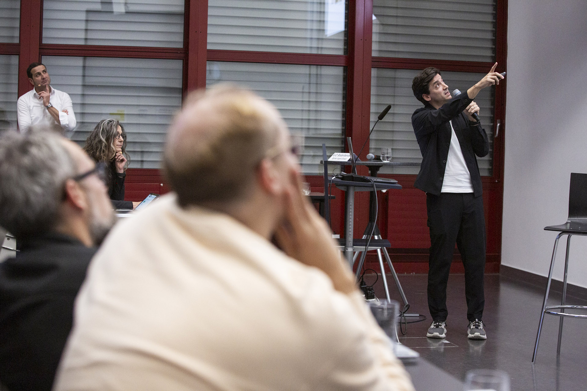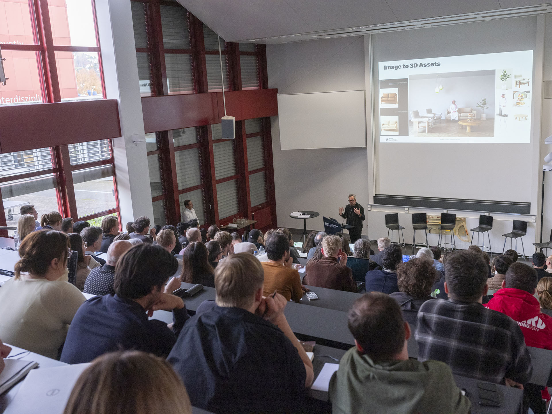 Zum Abschluss gaben drei Vertreter:innen der renommierten Architekturbüros Herzog & de Meuron, Foster + Partners und BIG in kurzen Inputreferaten Einblick in ihren Umgang mit und ihren Weg zu AI in der Architektur. Die Inputs machten klar: KI wird in der Praxis bereits heute strategisch und verantwortungsvoll eingesetzt – nicht als Ersatz, sondern als Verstärker gestalterischer Fähigkeiten. In der Podiumsdiskussion interessierten sich die Studierenden besonders für die Auswirkungen auf Berufsrollen, Ausbildungswege und kreative Prozesse. Der Nachmittag zeigte eindrucksvoll, wie sehr Digital Construction an vorderster Front aktueller Entwicklungen steht.