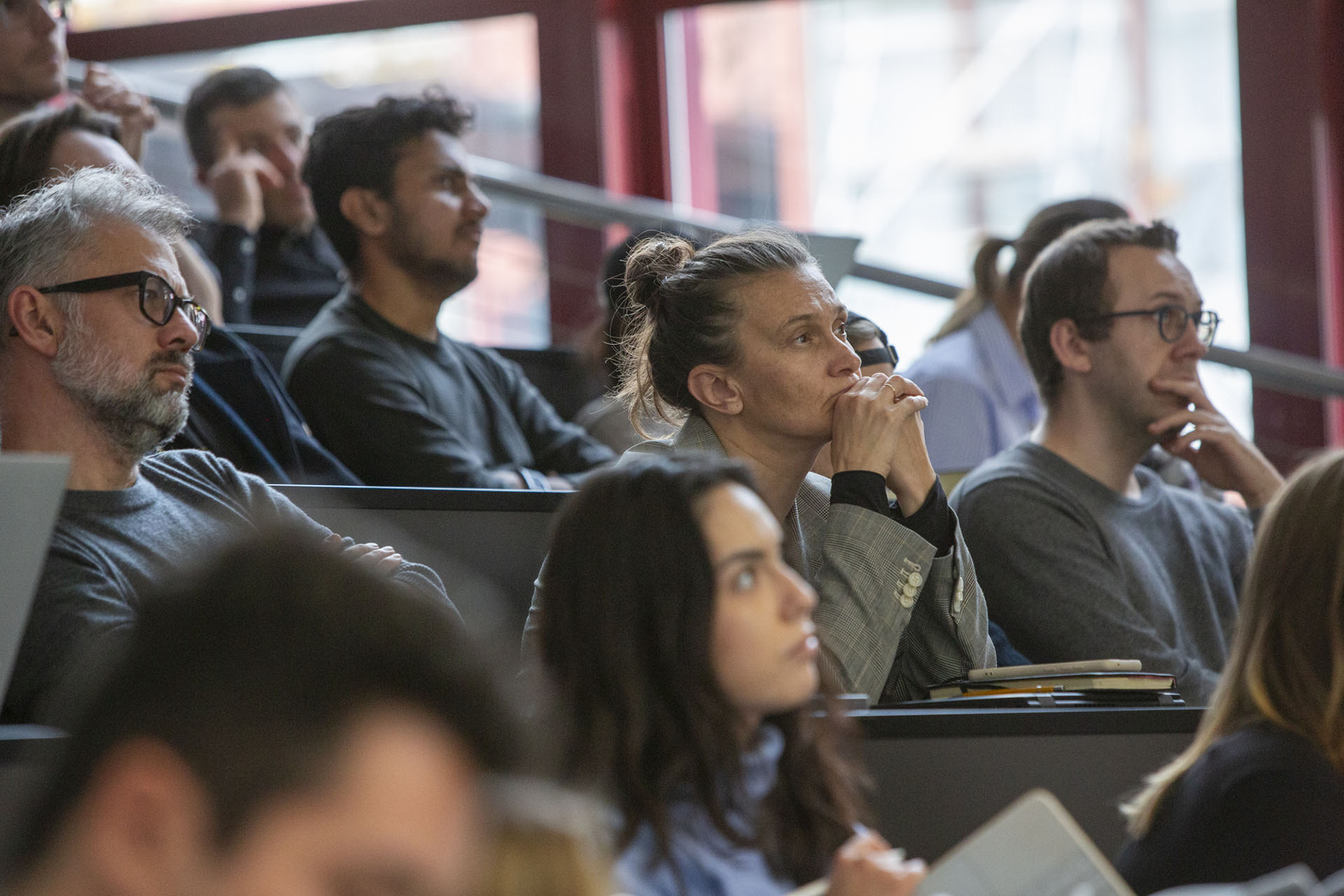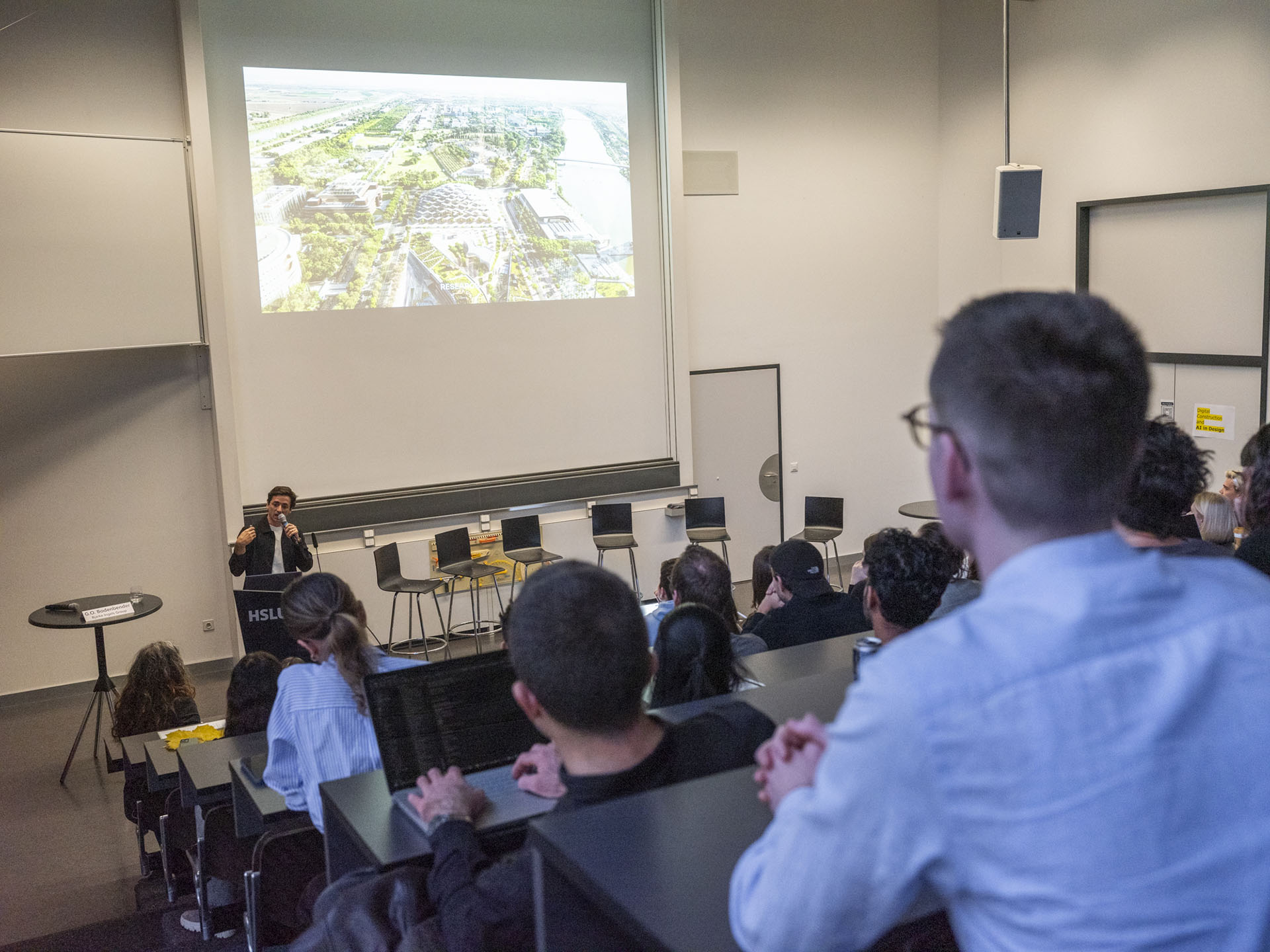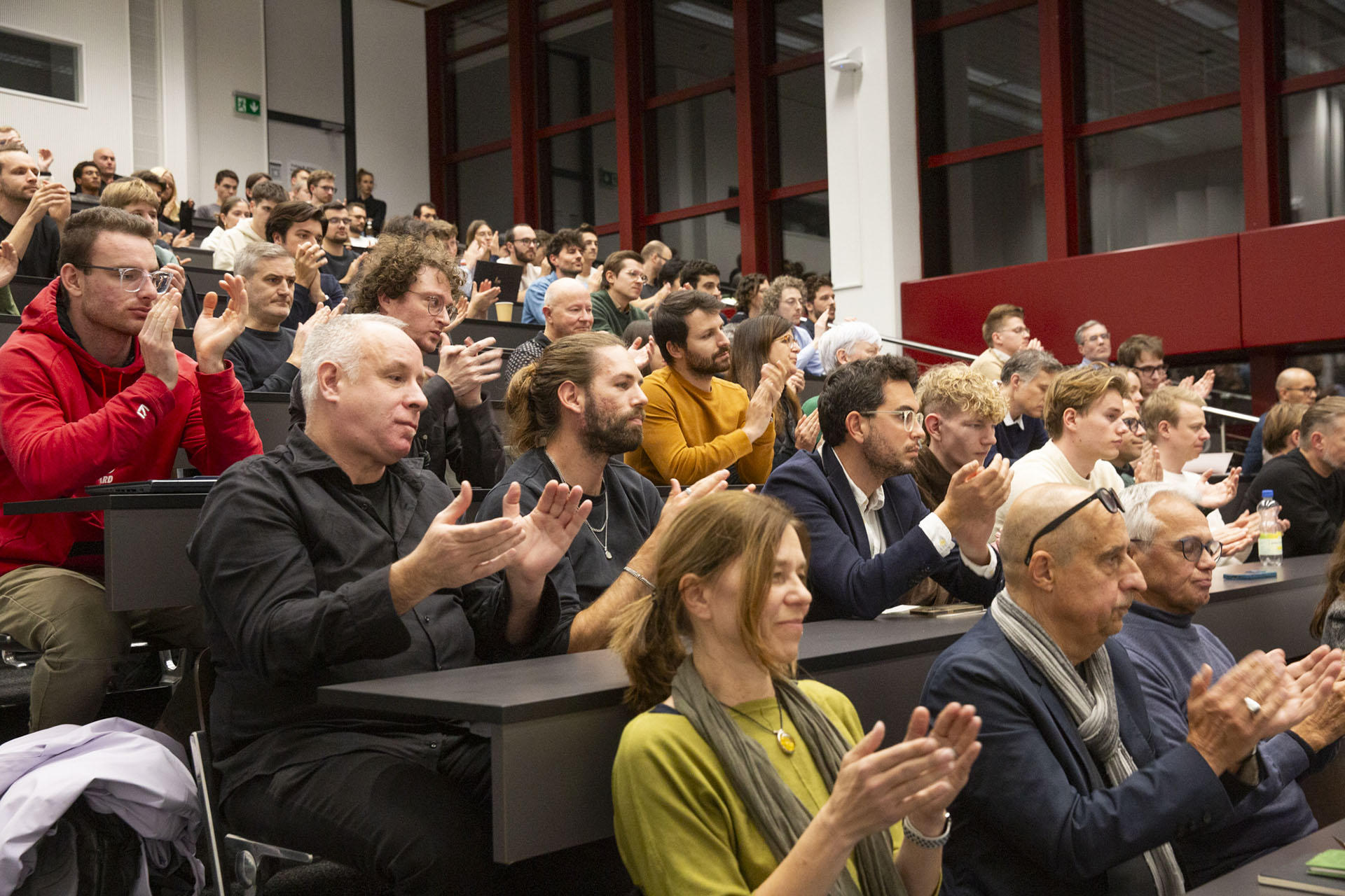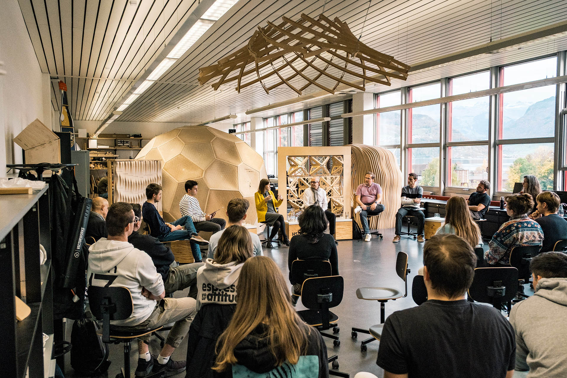 Zum Abschluss gaben drei Vertreter:innen der renommierten Architekturbüros Herzog & de Meuron, Foster + Partners und BIG in kurzen Inputreferaten Einblick in ihren Umgang mit und ihren Weg zu AI in der Architektur. Die Inputs machten klar: KI wird in der Praxis bereits heute strategisch und verantwortungsvoll eingesetzt – nicht als Ersatz, sondern als Verstärker gestalterischer Fähigkeiten. In der Podiumsdiskussion interessierten sich die Studierenden besonders für die Auswirkungen auf Berufsrollen, Ausbildungswege und kreative Prozesse. Der Nachmittag zeigte eindrucksvoll, wie sehr Digital Construction an vorderster Front aktueller Entwicklungen steht.