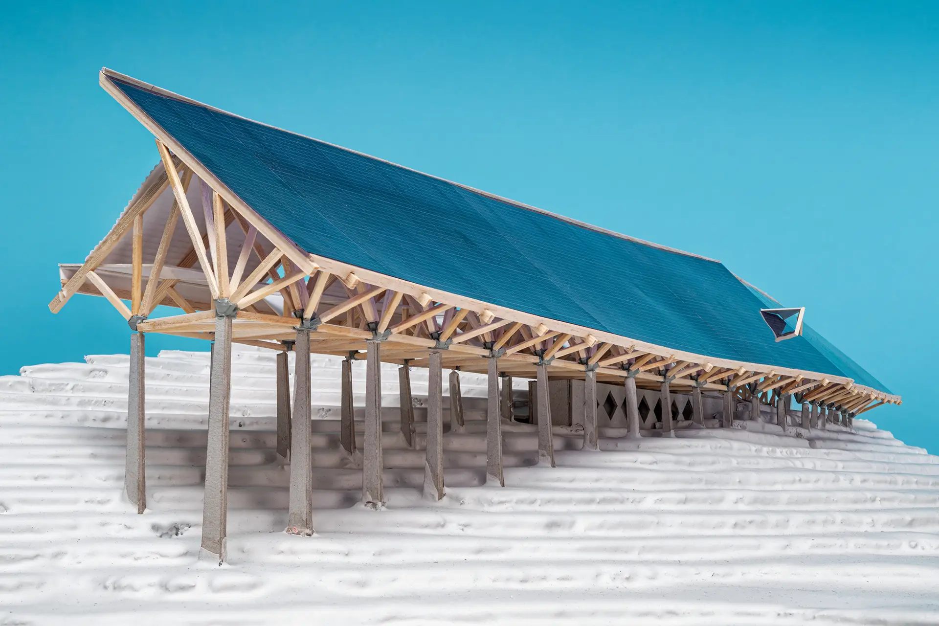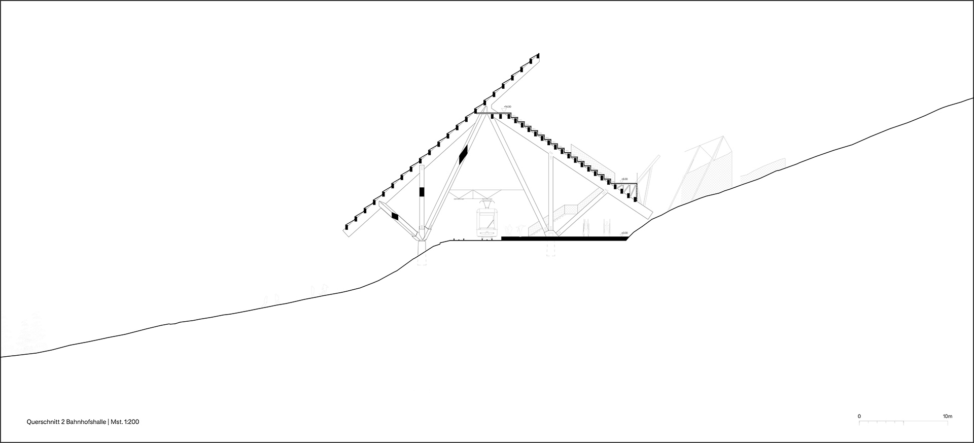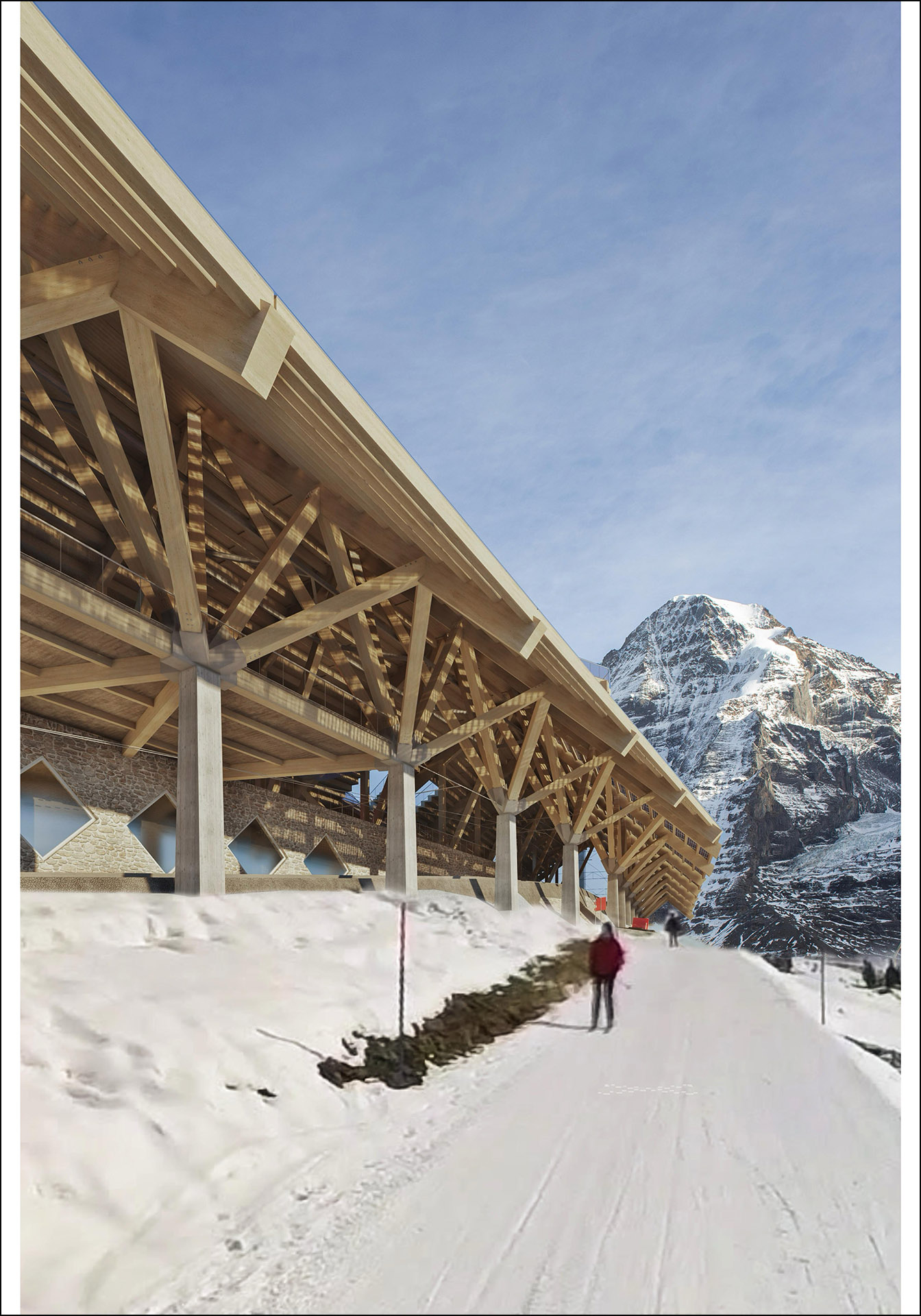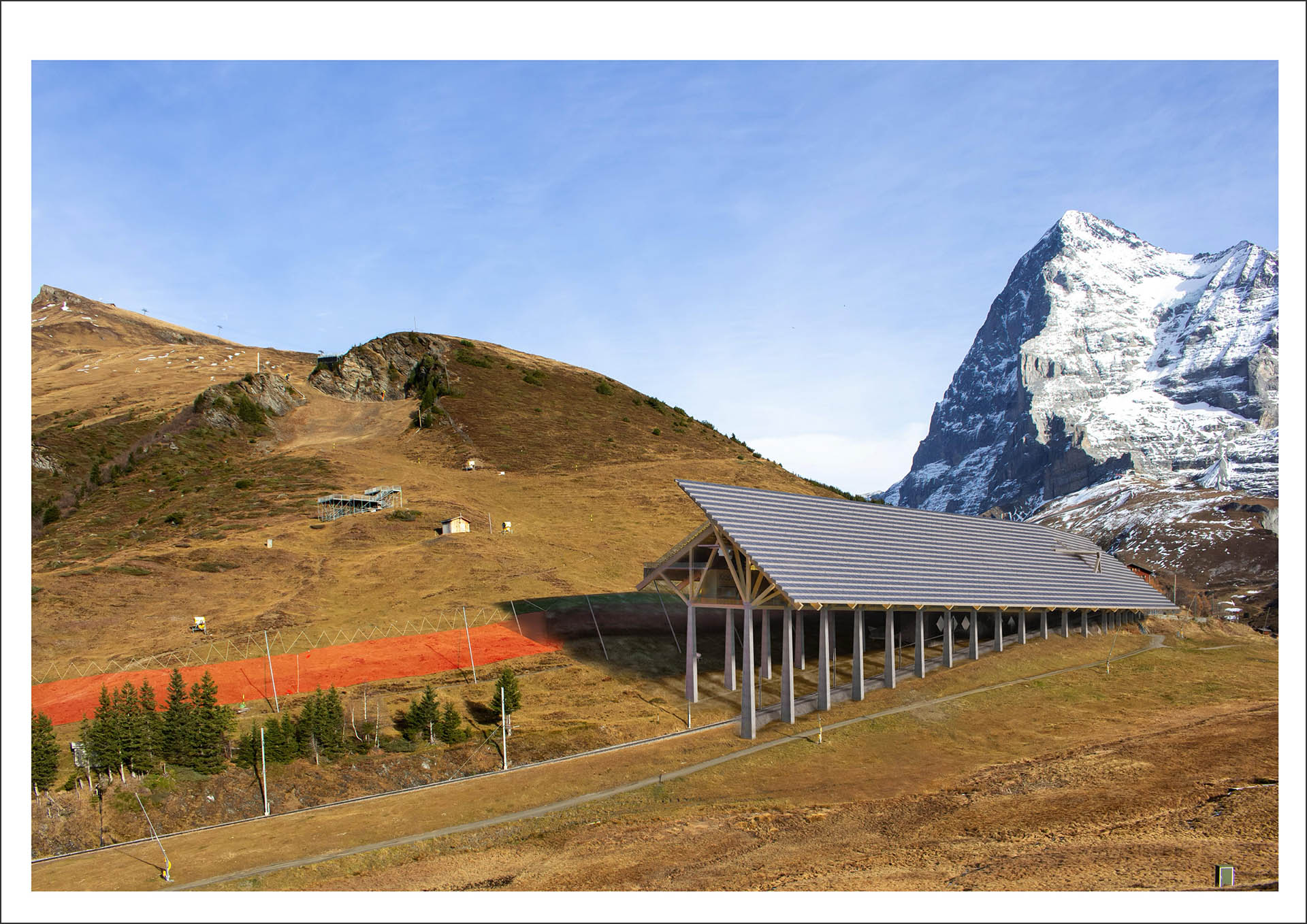 Die leichte Holzstruktur steht auf punktuellen Betonfundamenten mit vorfabrizierten Knoten und folgt in ihrer Anordnung dem Verlauf der bestehenden Bahnlinie. Unter einem grossen Dach vereint sie die Bahnhofshalle, die Festhalle und die Infrastruktur für das Rennen sowie eine Tribüne entlang der Hangseite. Die nach Süden ausgerichtete Dachfläche integriert eine grossflächige Photovoltaikanlage. Durch die permanente Infrastruktur werden Transport- und Aufwandsprozesse reduziert und das Lauberhornrennen erhält eine Basis auf der Wengneralp. Während des Veranstaltungstags haben die Besucher:innen einen direkten, kontrollierten Zugang von der Bahn zur Tribüne, in der Nebensaison dient die Halle als Lager- und Betriebsraum. Die Struktur unterstützt das Skigebiet im Betrieb und integriert die Alpwirtschaft durch erweiterte Wirtschafts- und Logistikflächen, die einen direkten Bahnanschluss bieten.