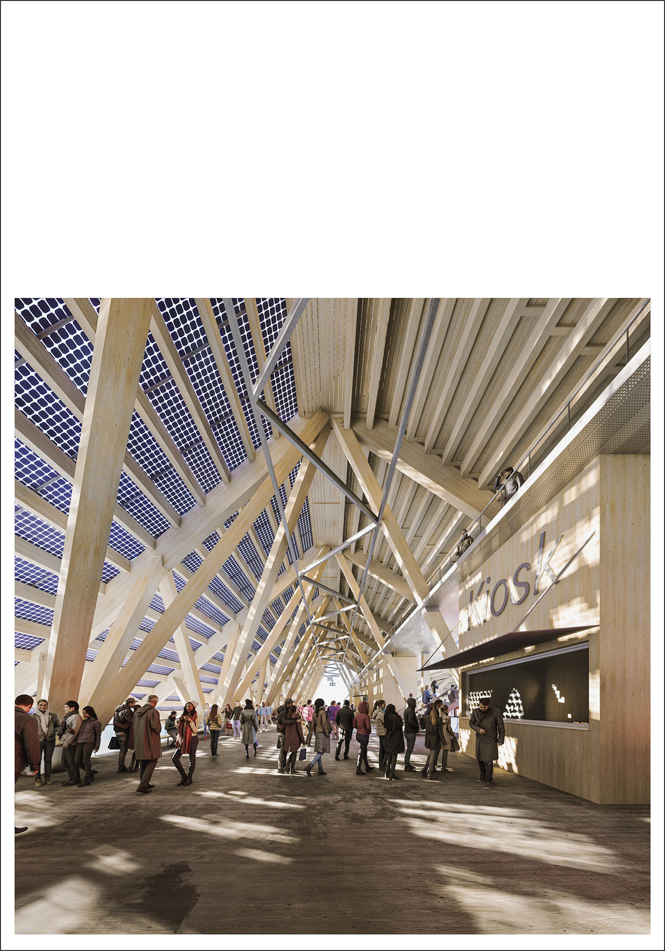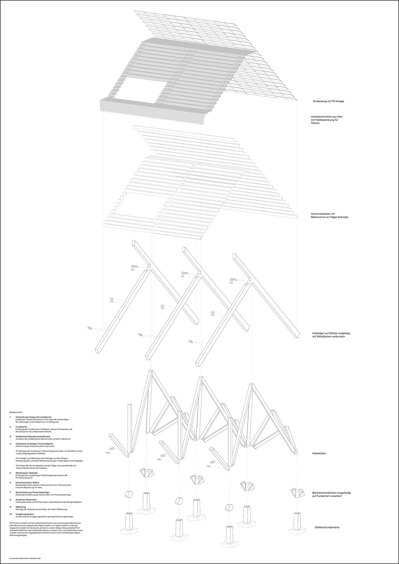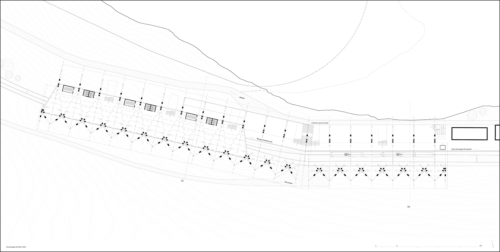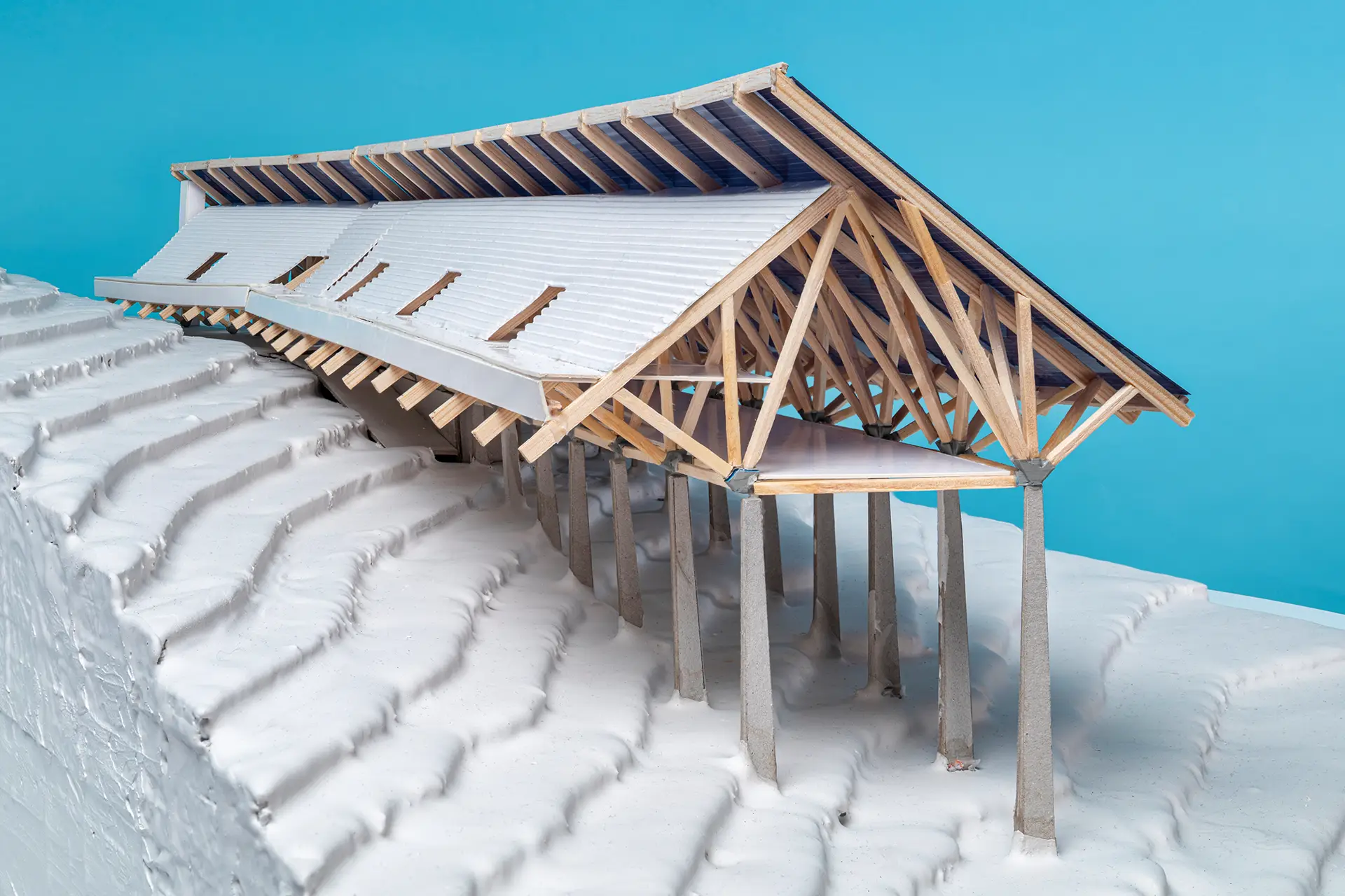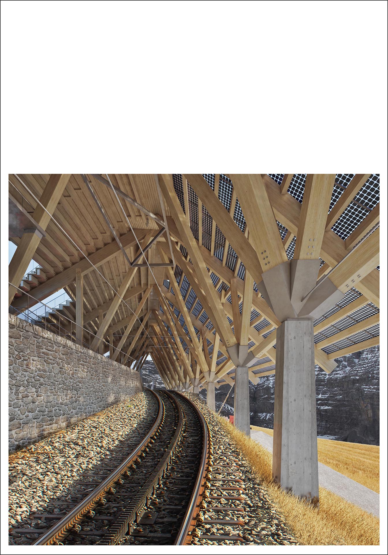 Die leichte Holzstruktur steht auf punktuellen Betonfundamenten mit vorfabrizierten Knoten und folgt in ihrer Anordnung dem Verlauf der bestehenden Bahnlinie. Unter einem grossen Dach vereint sie die Bahnhofshalle, die Festhalle und die Infrastruktur für das Rennen sowie eine Tribüne entlang der Hangseite. Die nach Süden ausgerichtete Dachfläche integriert eine grossflächige Photovoltaikanlage. Durch die permanente Infrastruktur werden Transport- und Aufwandsprozesse reduziert und das Lauberhornrennen erhält eine Basis auf der Wengneralp. Während des Veranstaltungstags haben die Besucher:innen einen direkten, kontrollierten Zugang von der Bahn zur Tribüne, in der Nebensaison dient die Halle als Lager- und Betriebsraum. Die Struktur unterstützt das Skigebiet im Betrieb und integriert die Alpwirtschaft durch erweiterte Wirtschafts- und Logistikflächen, die einen direkten Bahnanschluss bieten.