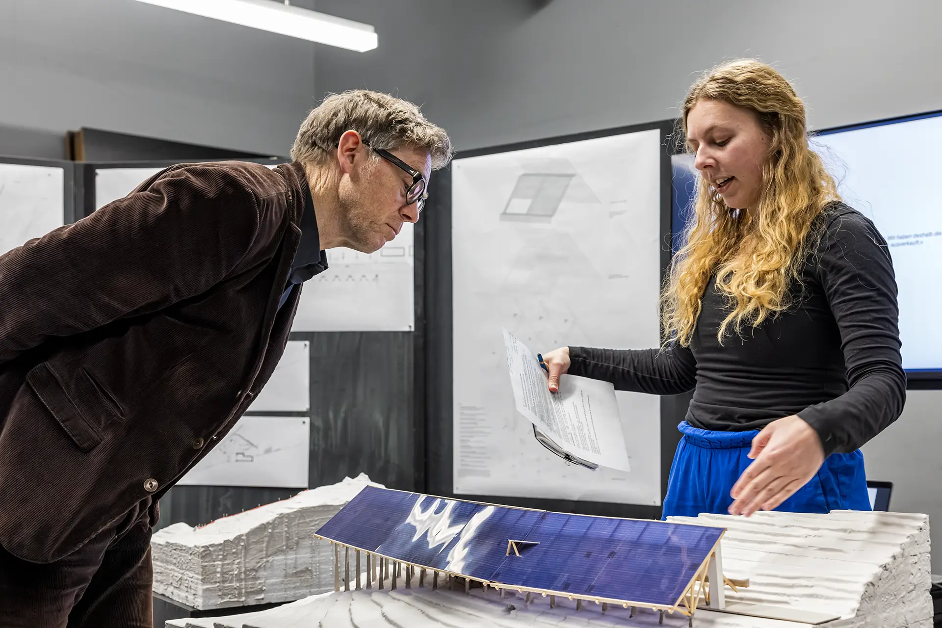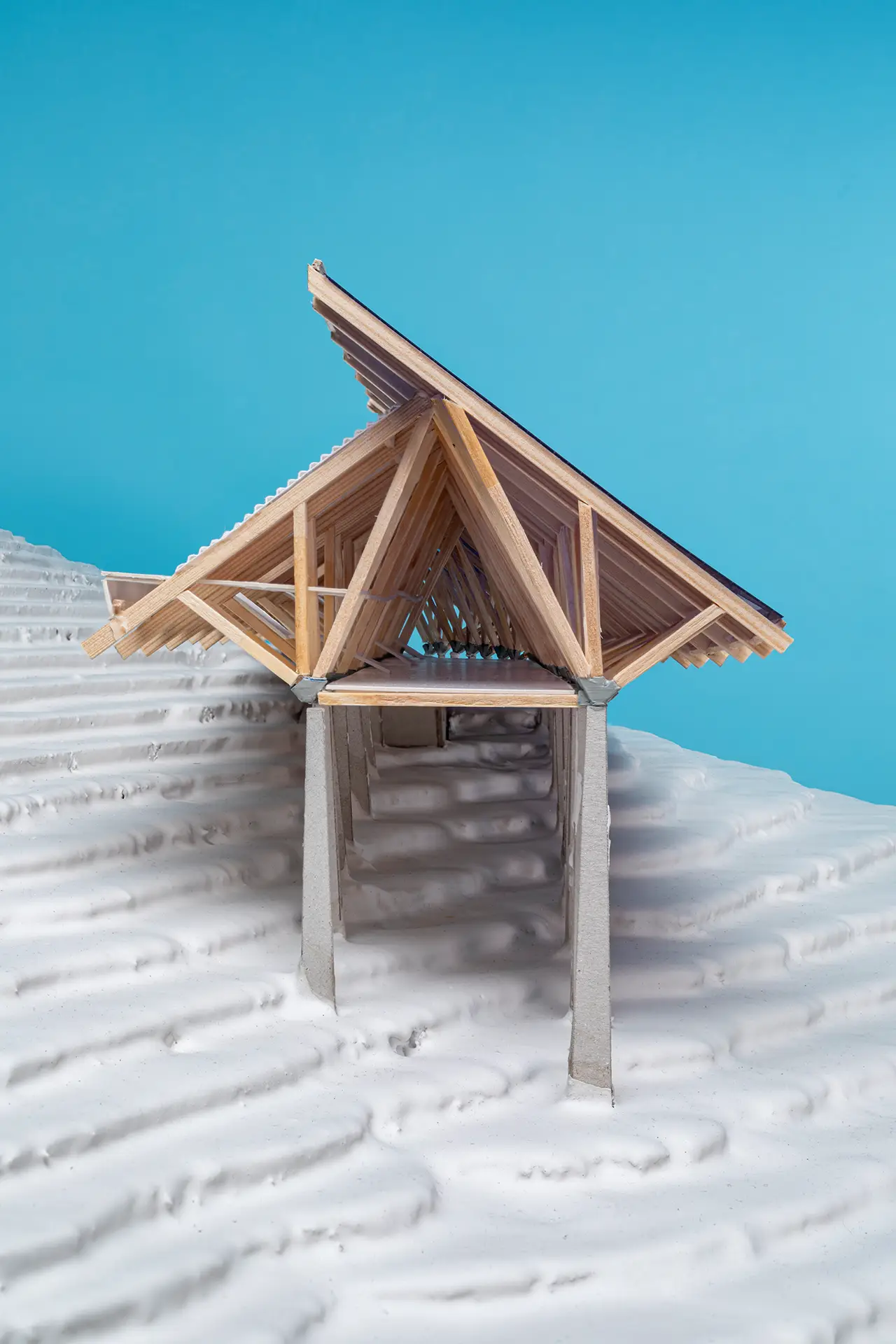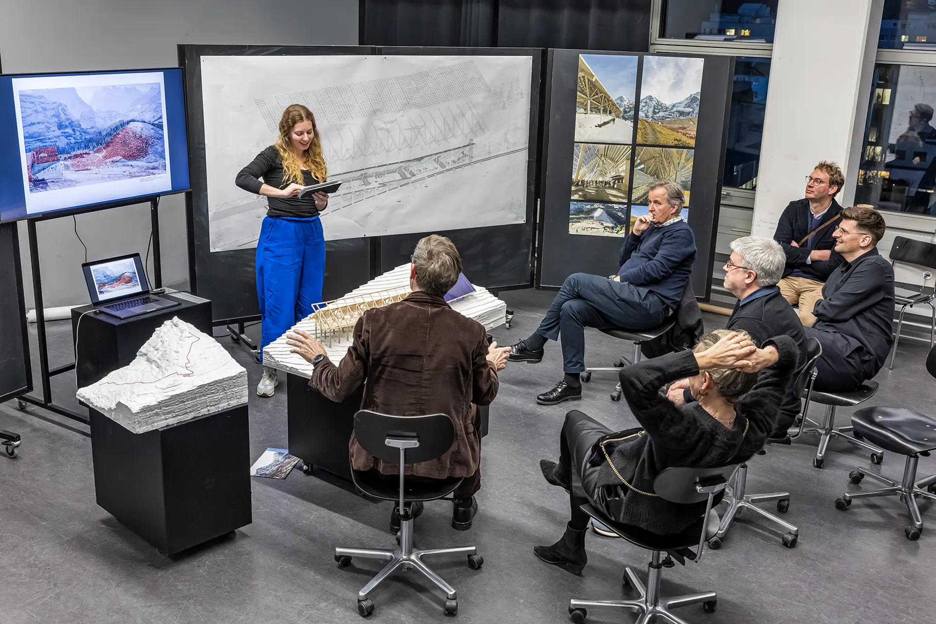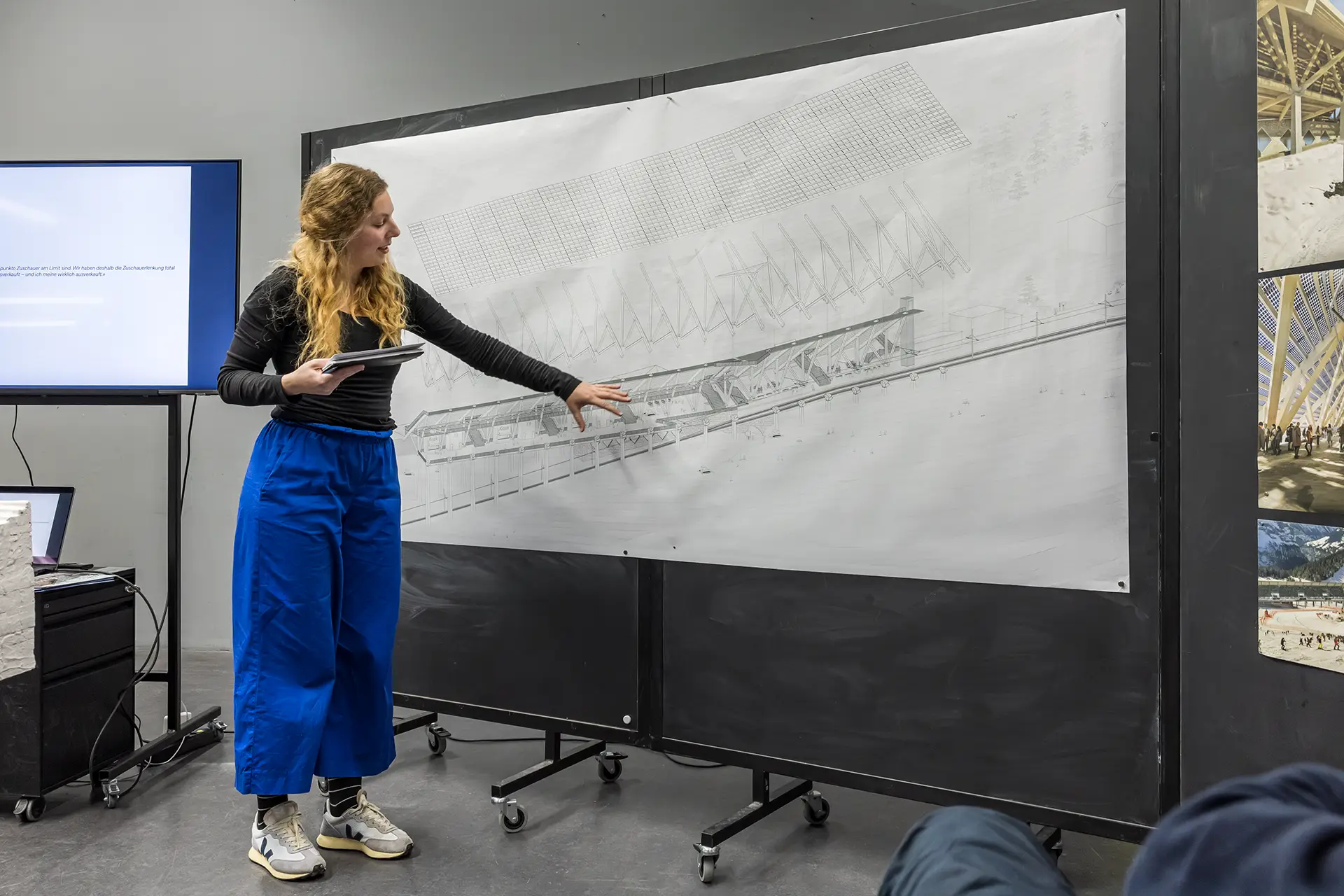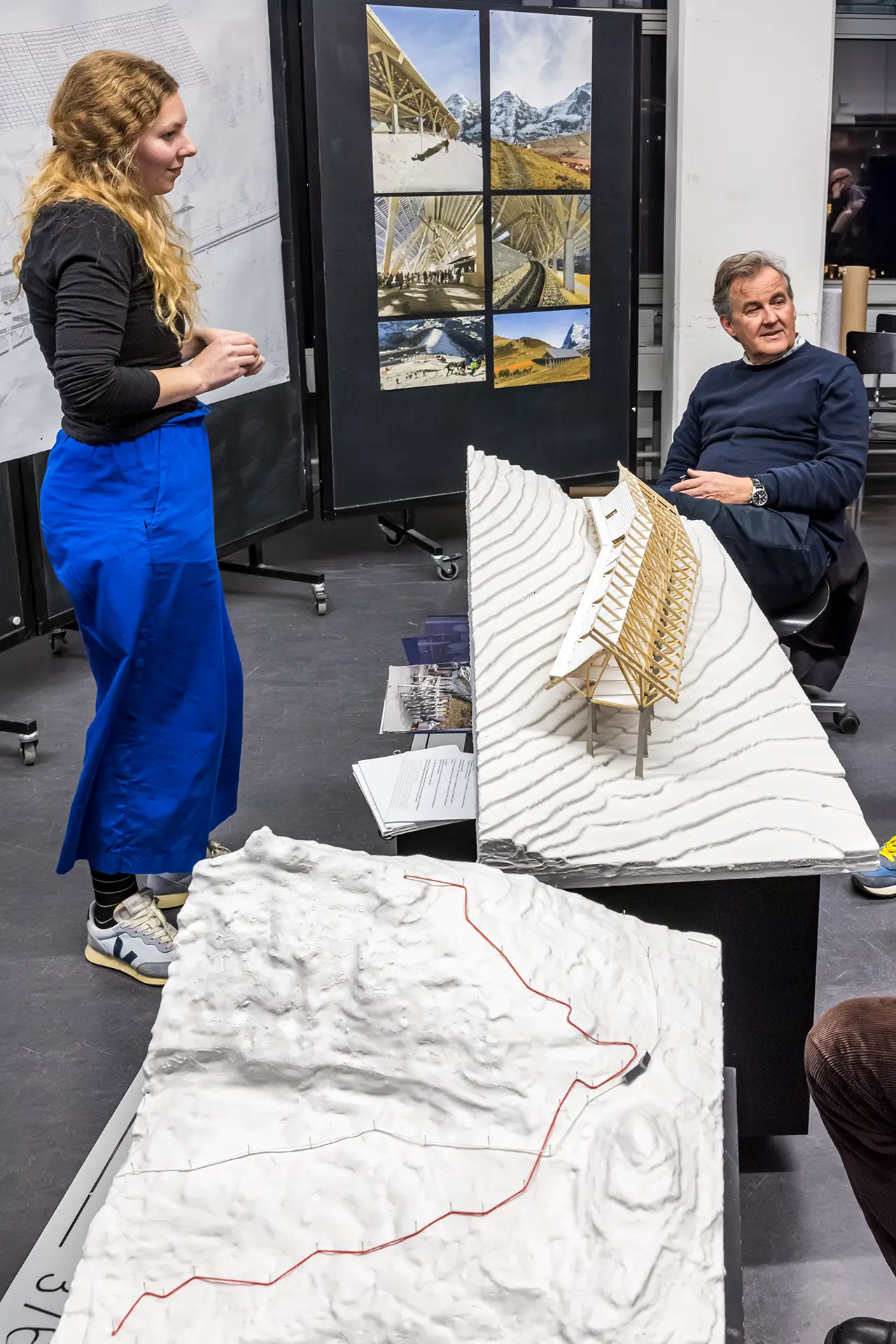 Im Masterstudio von Felix Wettstein erforschten die Studierenden im Herbstsemester 2025 die Tourismusinfrastruktur in der Region Interlaken. Lucia Spörri beschäftigte sich mit dem Lauberhornrennen in Wengen und entwarf eine Holzstruktur, die sowohl als Tribüne für das weltberühmte Skirennen dient, wie auch eine Käserei, ein Festsaal, Lagerräume und den Bahnhof der Wengernalpbahn beherbergt.