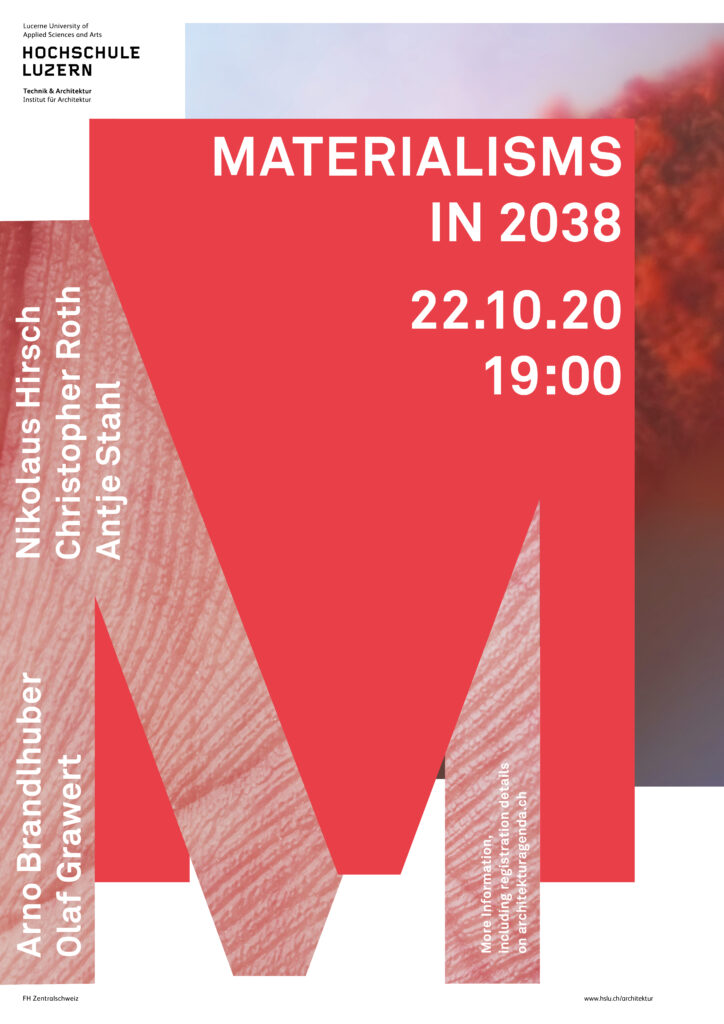 In the Autumn Semester 2020 Heike Biechteler organized a lecture series on the topic «Materialisms». They discussed issues of space and its material articulations as well as phenomena of immaterialities, be it through emergent fields of political, social, digital or ecological changes – or simply by questioning architecture’s traditional position within nature and culture.