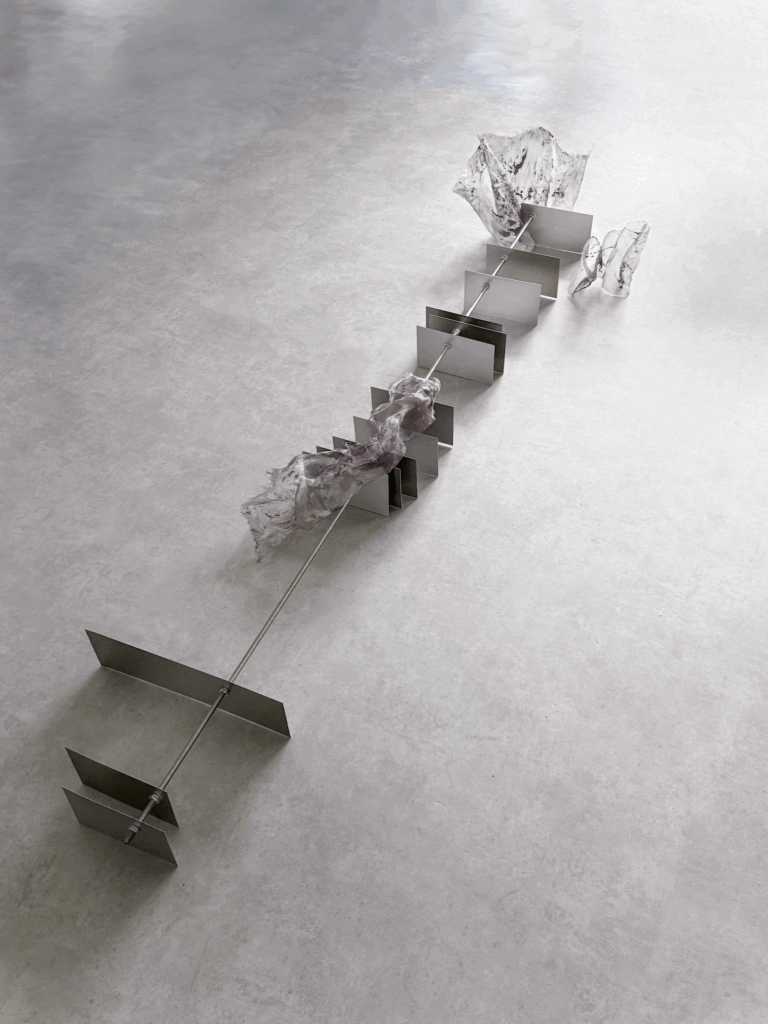 «Diese skulpturale Arbeit kombiniert industrielle Präzision mit organischer Freiheit. Eine Reihe flach geschnittener Aluminiumscheiben bildet das strukturelle Rückgrat des Werkes. Die Scheiben sind mit einer durchgehenden Stahlstange axial verbunden und mittels Muttern fixiert. Diese lineare, streng modulare Grundstruktur erzeugt eine klare Rhythmik aus serieller Wiederholung und geometrischer Strenge.