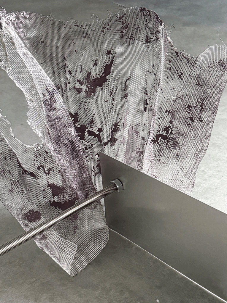 Im starken Kontrast dazu stehen frei geformte Metallgitterelemente, die sich um die Achse winden und über die formale Ordnung hinaustreten. Ihre amorphe Gestalt und Oberflächenbehandlung erzeugen eine spannungsvolle Dialogsituation zwischen Konstruktion und Auflösung. Die Gitter wurden mit einer experimentellen Schichttechnik bearbeitet: Durch das Auftragen und Übergießen von Kreidefarbe, Wachs und Acryl entstehen semi-transparente, in Teilen geschlossene Oberflächen, die an gewebte oder wabenartige Strukturen erinnern.