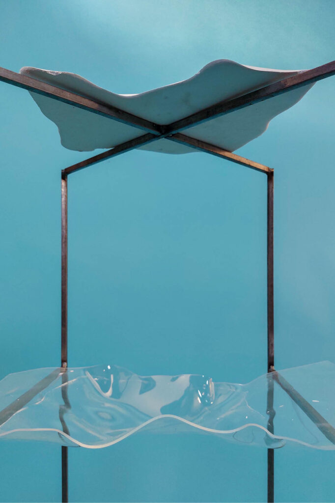 Das Spiel mit Transparenz und Materialdichte lässt Assoziationen an natürliche Wachstumsprozesse, Erosionsspuren oder organische Hautstrukturen zu – stets im Wechselspiel mit der kühlen, technisch anmutenden Linearisierung der Aluminiumkomponenten.»