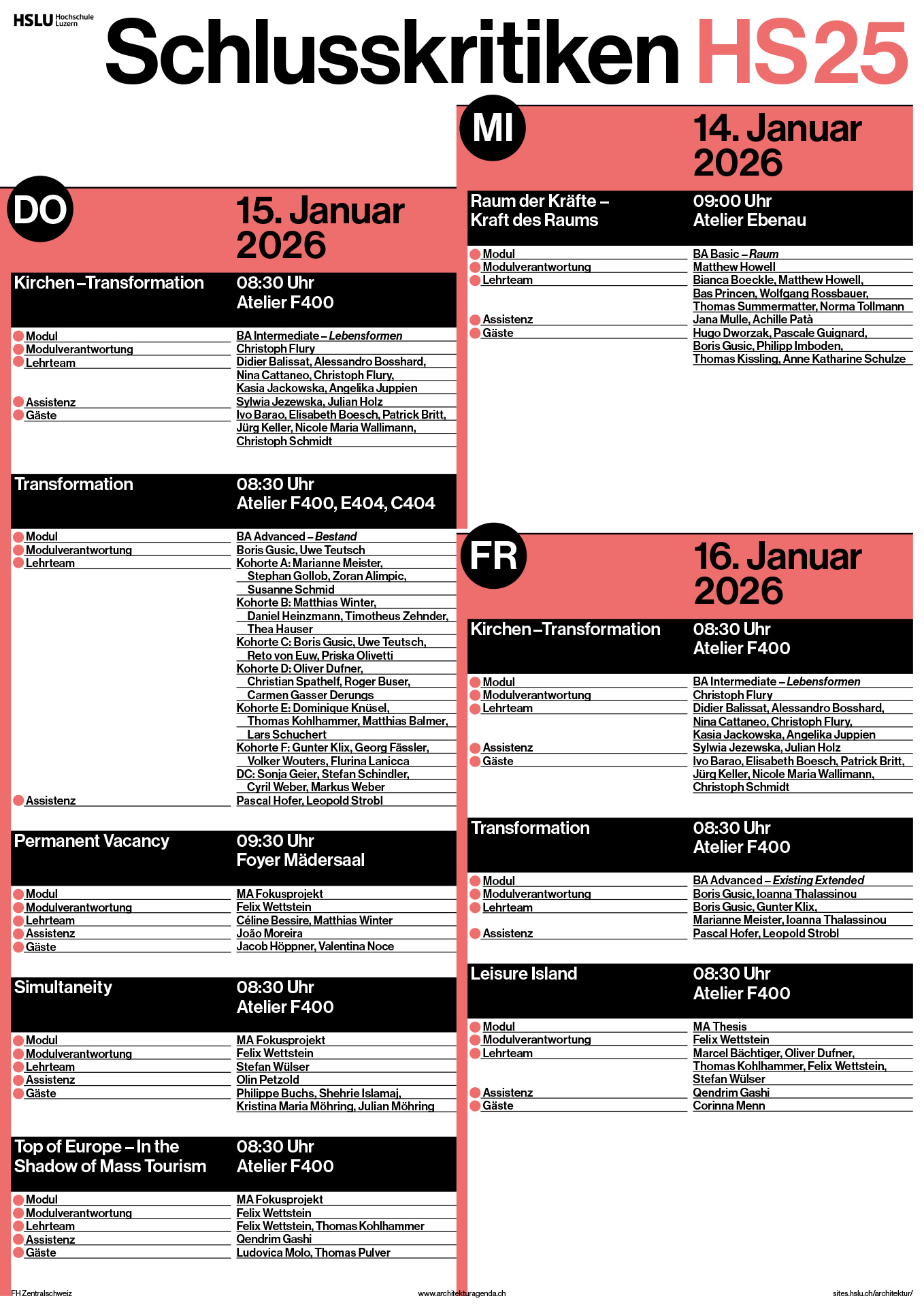 Die Schlusskritiken der verschiedenen Projektmodule auf allen Stufen finden wie folgt statt. Die Kritiken sind öffentlich. Alle sind herzlich willkommen.