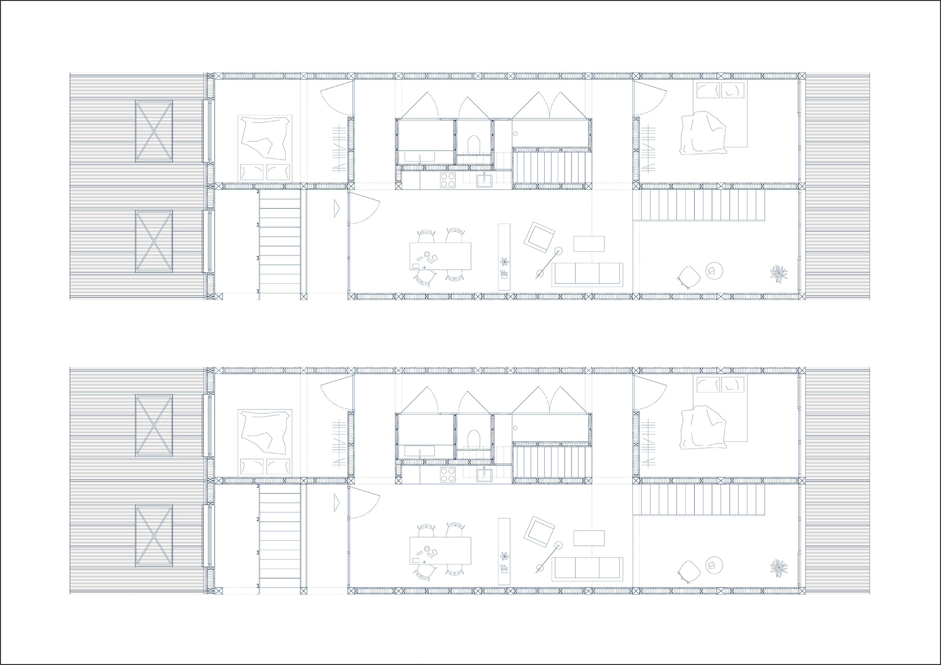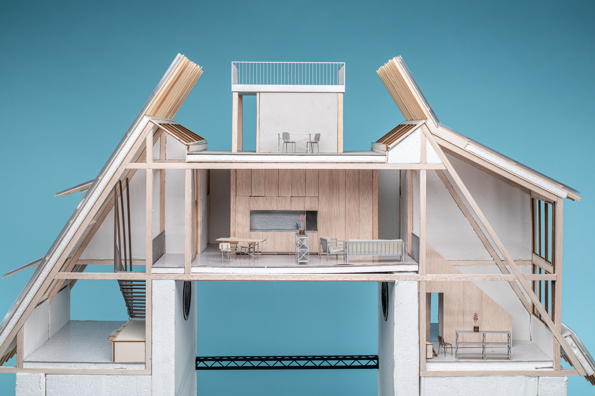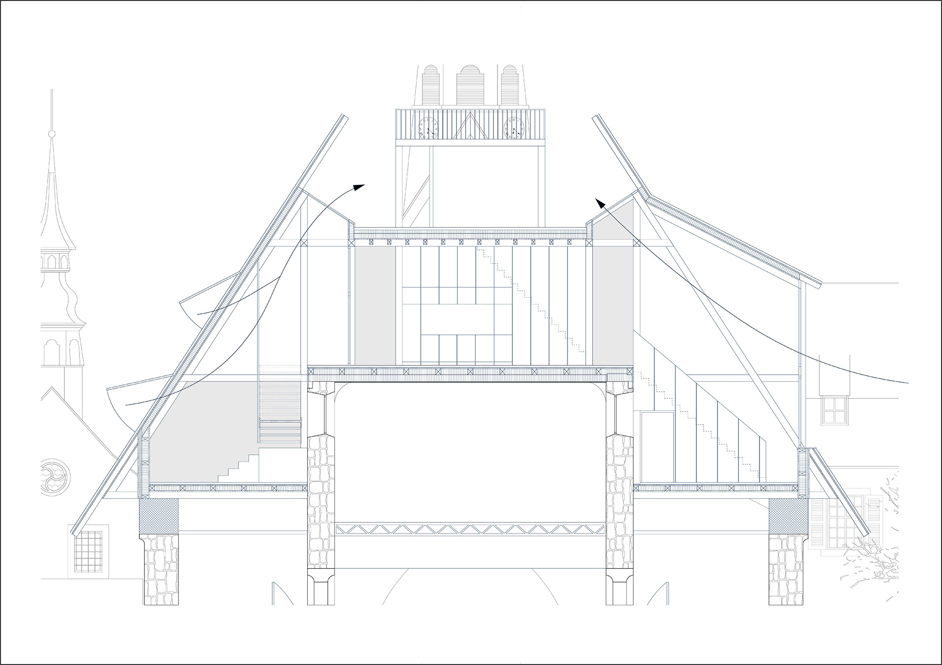Über der Basilika entstehen Wohnungen als eigenständige Schicht. Die besondere Wohnform ergibt sich aus der vertikalen Überlagerung von Alltag und Kultur, während der sakrale Raum in seiner vollen Höhe erlebbar bleibt. Die Erschliessung erfolgt über einen inneren Laubengang oberhalb des nördlichen Seitenschiffs, der als belebte Quartierstrasse mit Aufenthaltsmöglichkeiten gedacht ist. Die Wohnungen sind als Zweispänner organisiert und folgen mit schottenartigen Wänden dem Rhythmus der Basilikabögen. Wohn- und Schlafzonen liegen jeweils auf gegenüberliegenden Seiten der Schotten, alle Zimmer sind gleich gross. Küche, Bad und Treppe sind in einer kompakten Servicezone gebündelt, die Wohnungen sind als Maisonettes ausgebildet und reichen eine Ebene tiefer in das südliche Seitenschiff. Das Dach wird neu gestaltet und als leichte Holzbaukonstruktion ausgeführt. Die zeitgenössische Form setzt sich bewusst vom historischen Bestand ab, respektiert jedoch dessen Proportionen und Volumetrie. Im Inneren reagiert die Materialität des Leichtbaus mit Terrazzoböden und Lehmputzwänden auf den massiven Bestand und verleiht den Wohnräumen eine ruhige, angemessene Schwere.