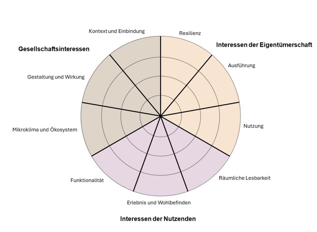 Arbeit: Der Spider basiert auf den acht Kriterien des Davos Qualitätssystem für hohe Baukultur. Diese werden adaptiert und anhand der drei Kategorien Eigentümerschaft, Nutzende und Gesellschaftsinteressen gegliedert. Die Bewertung erfolgt qualitativ und wird in einem radialen Diagramm visualisiert – als Gesprächsgrundlage für Planende und Auftraggeber:innen.