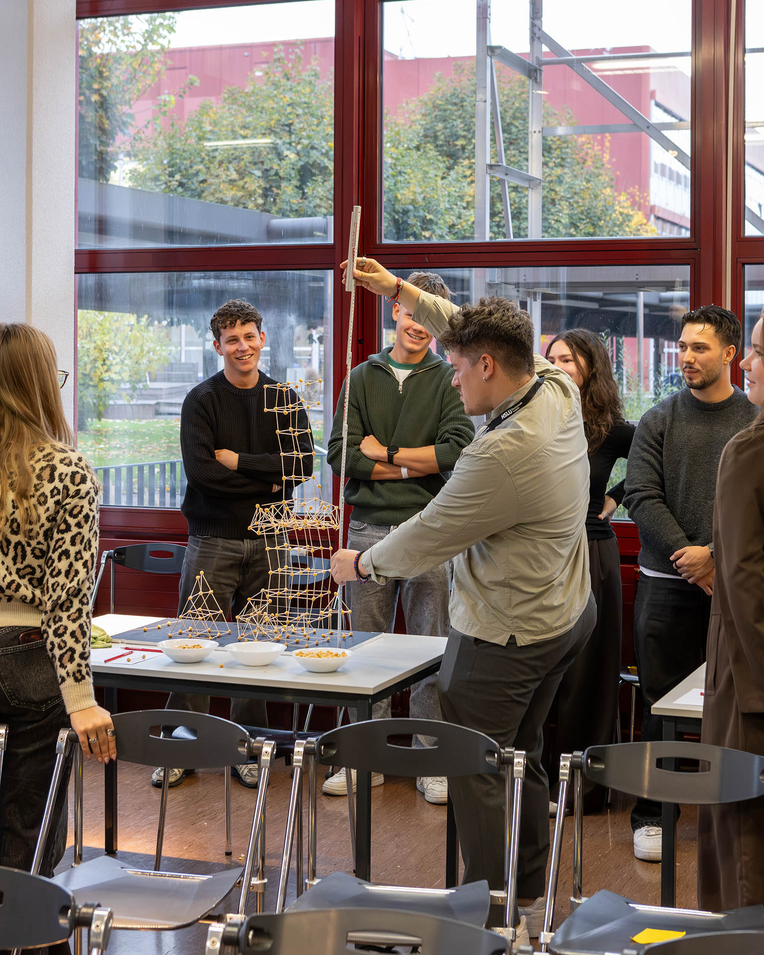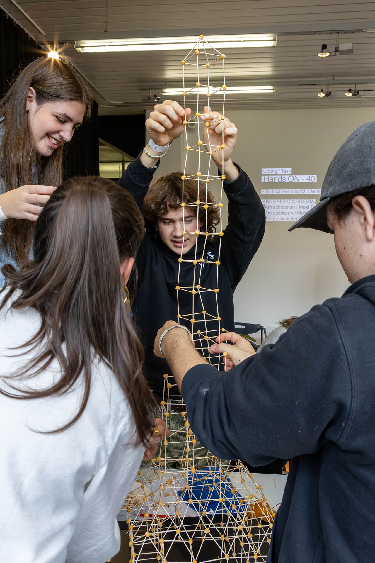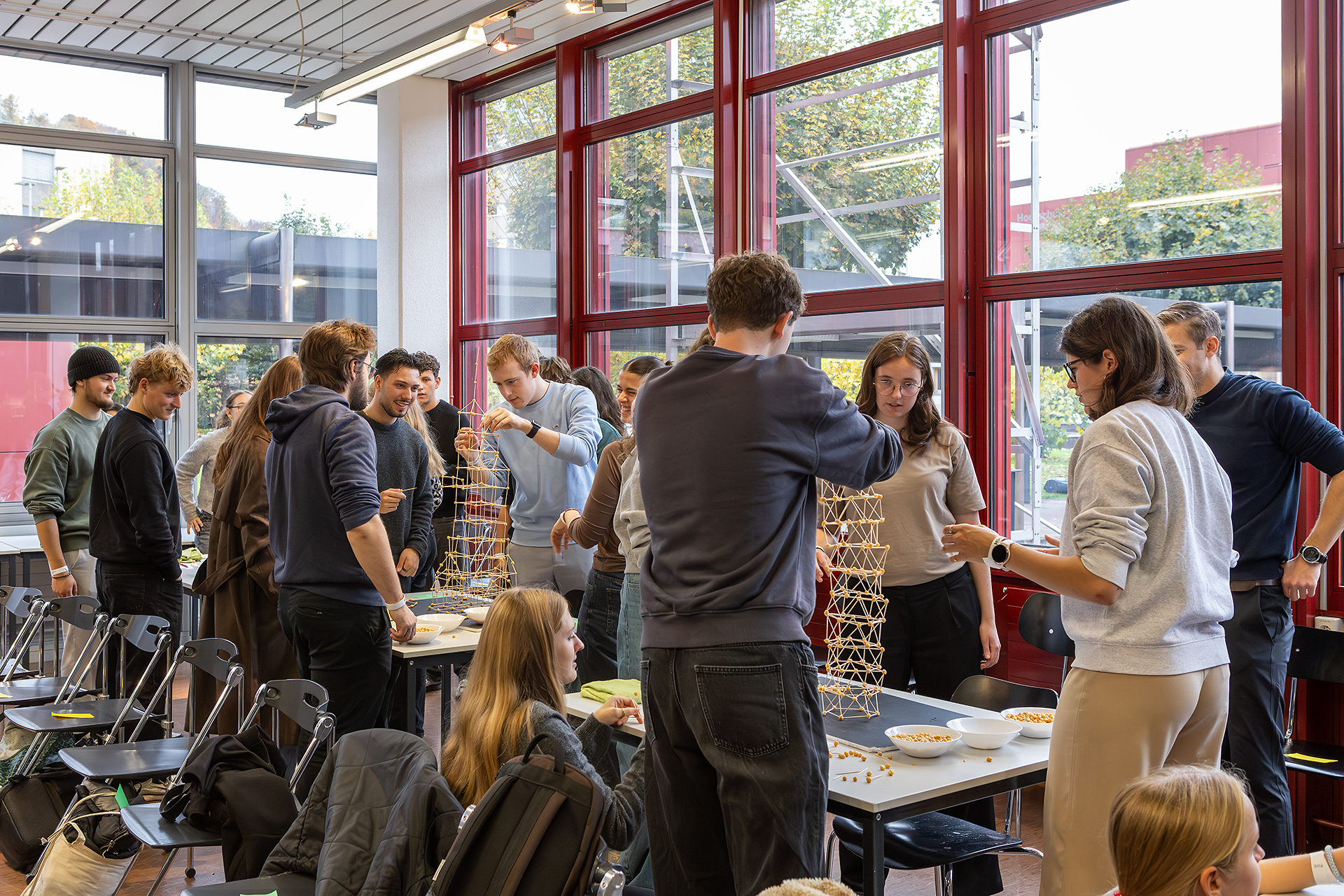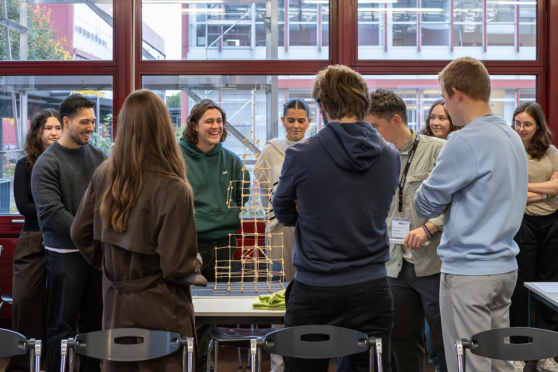 Die rund 100 Interessentinnen und Interessenten des Bachelor Architektur durften auch gleich selber Hand anlegen und ihre Fertigkeit beim Bauen austesten – so hoch wie möglich, präzise und schön!