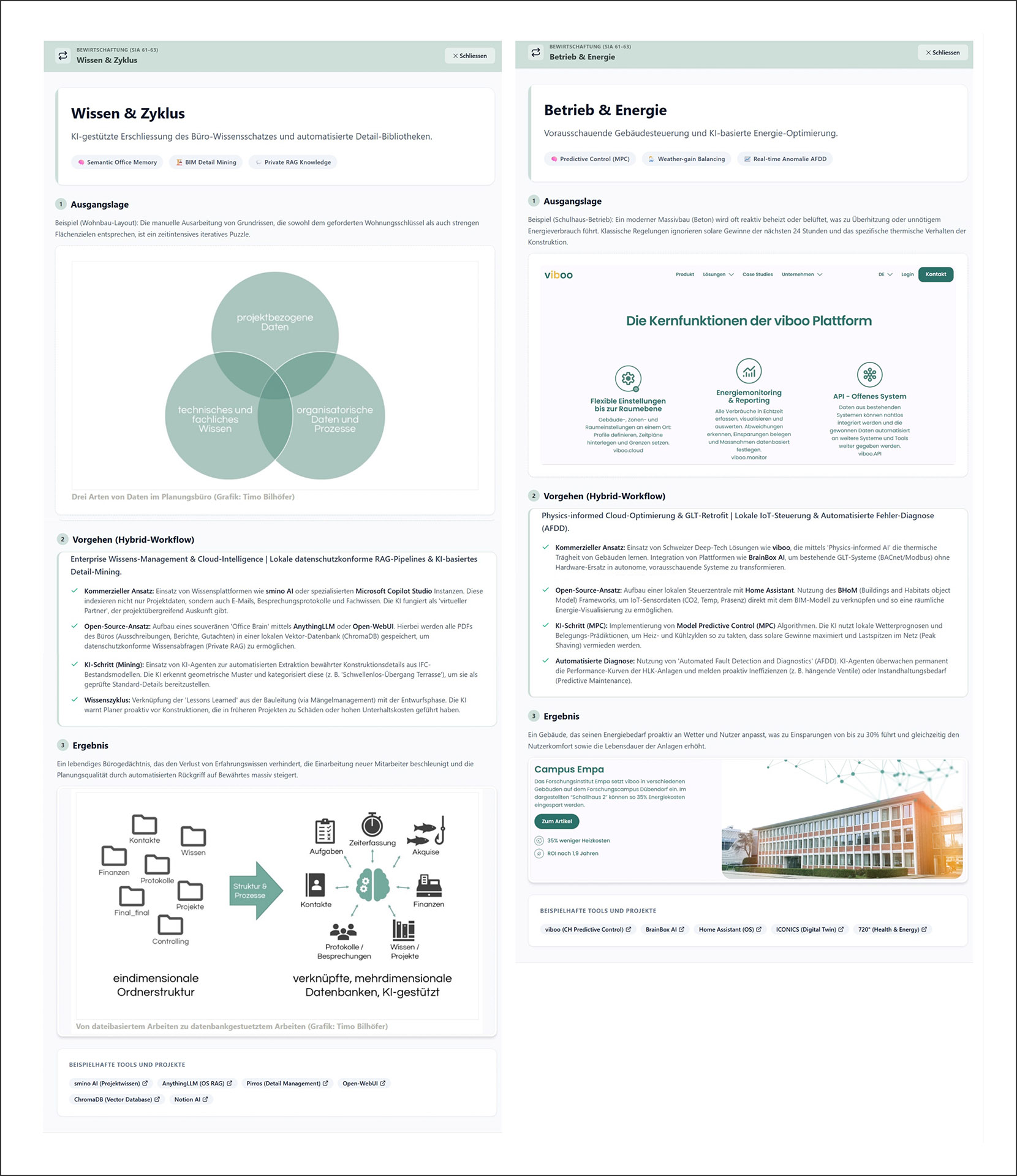 Detailansicht zweier Anwendungsfälle («Betrieb & Energie»/ «Wissen & Zyklus»). Die Darstellung zeigt die standardisierte Prozessstruktur sowie die Verknüpfung mit konkreten Tools und Ergebnissen.