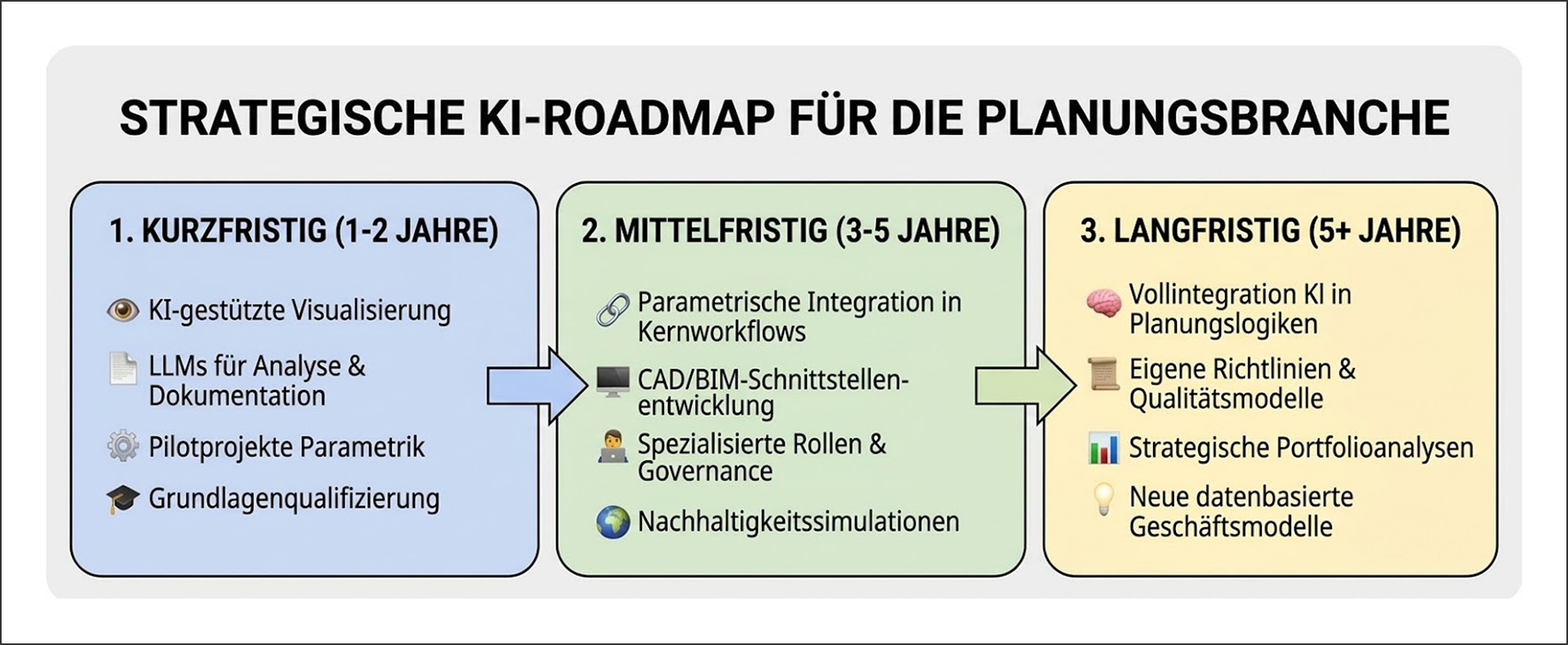 Zeitlich gestufte Integrationsstrategie für KI in Architekturbüros (kurz-, mittel- und langfristige Entwicklungsperspektiven)