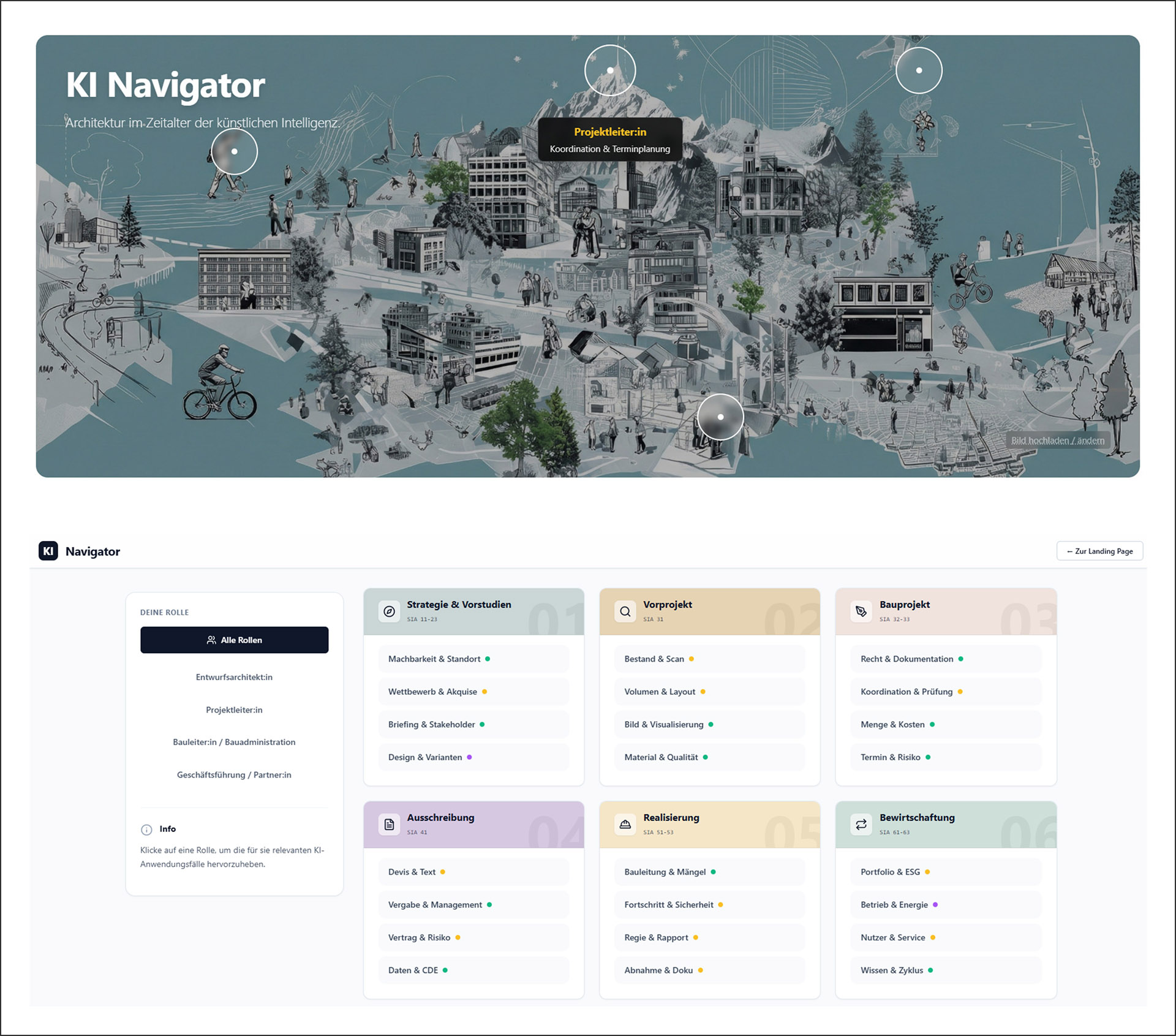 Landing Page des KI-Navigators mit rollenbasiertem Einstieg. Der visuelle Zugang über interaktive Hotspots führt zu einer rollenbezogenen Filterung der Anwendungsfälle.