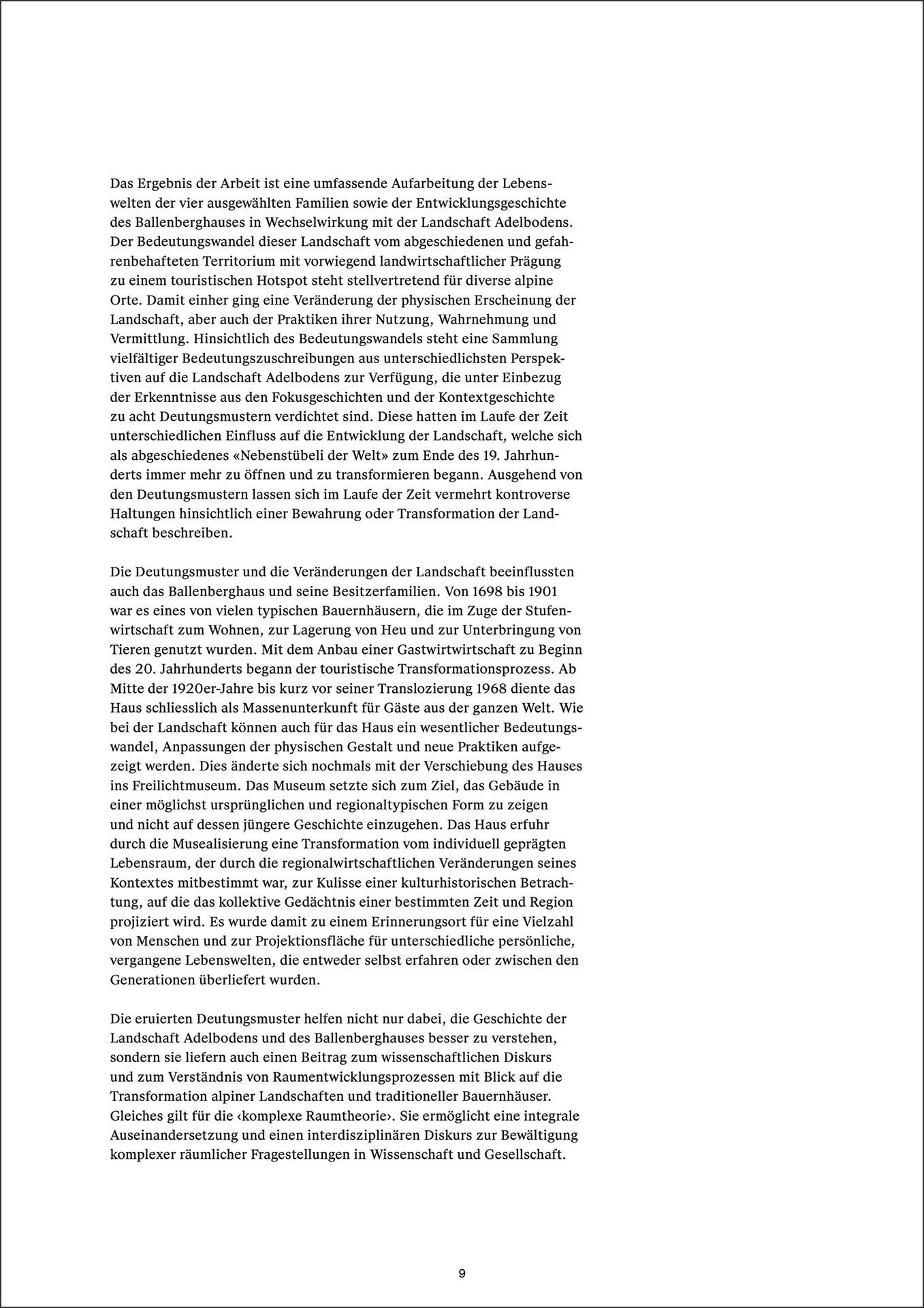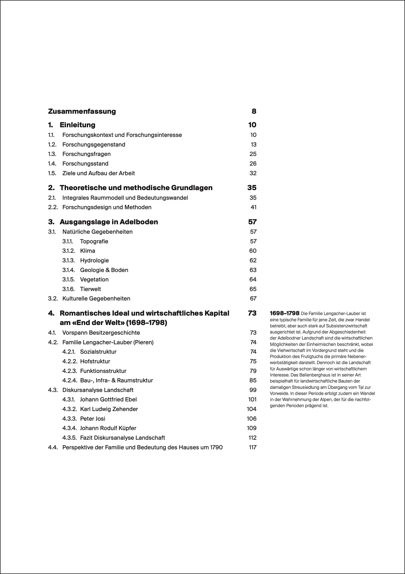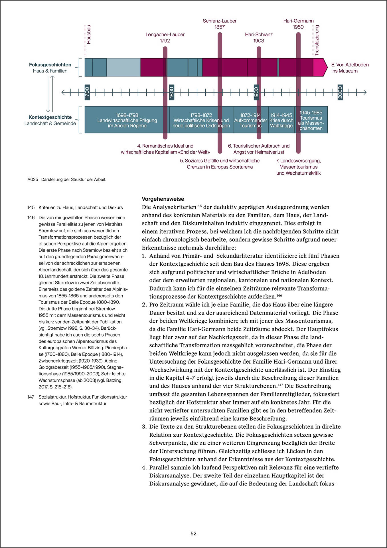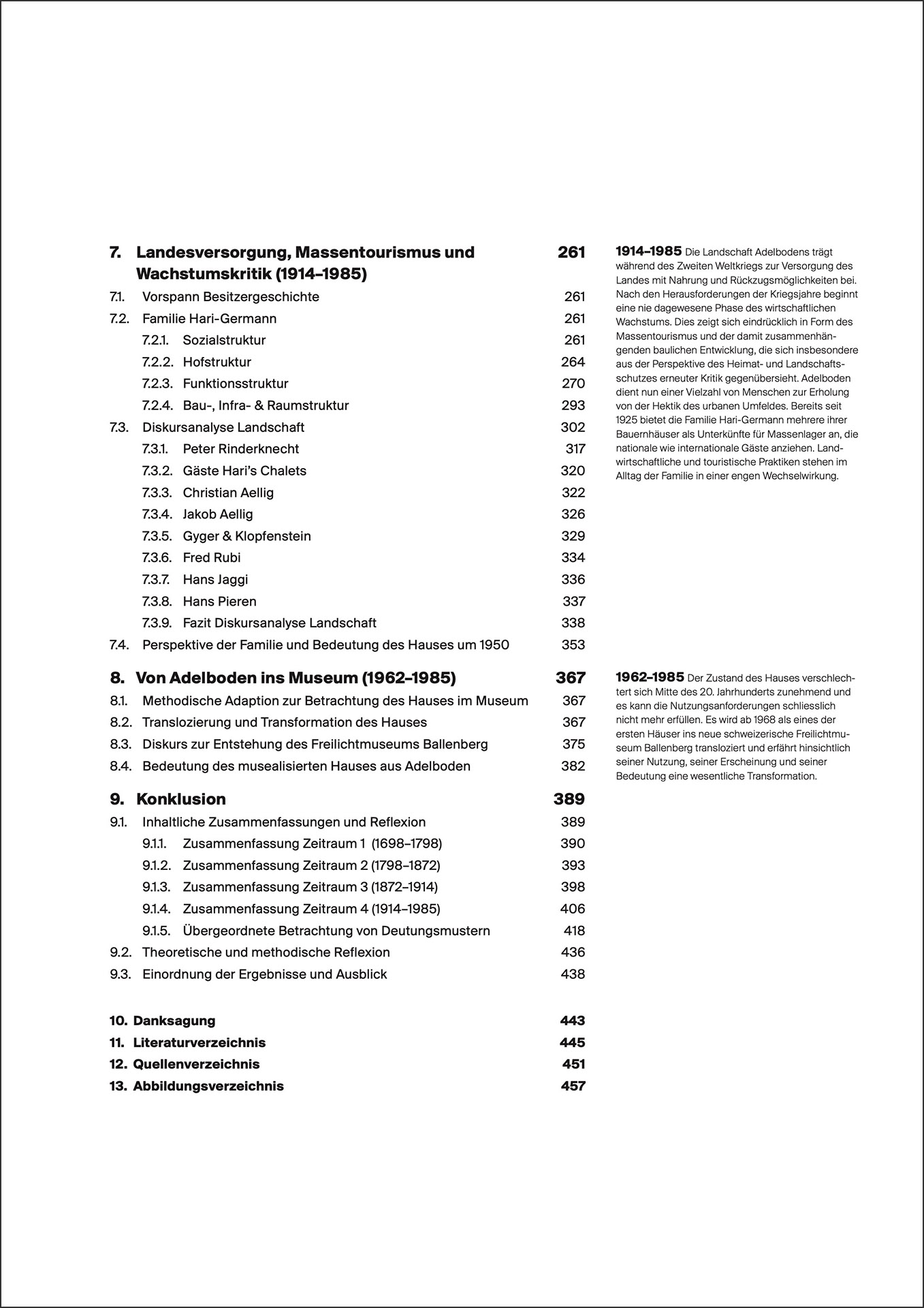 Stefan Kunz schildert diese vielfältigen Prozesse anhand der Landschaft in Adelboden. Er zeichnet die Lebenswelten der Menschen vor Ort in unterschiedlichen Zeiträumen nach, die vom Spannungsfeld zwischen bäuerlicher Tradition und touristischer Moderne geprägt waren. Die Kontextgeschichte der Landschaft setzt er dabei in Beziehung zu den Fokusgeschichten der Bewohnenden des Hauses, welches 1698 in Adelboden errichtet und 1968 ins Freilichtmuseum Ballenberg überführt wurde. Mithilfe eines raumtheoretischen Ansatzes untersucht er die Transformation des physischen, des prozessualen und des symbolischen Raums über eine Dauer von 270 Jahren. Dies ermöglicht vertiefte Einblicke in den historischen Diskurs und den Bedeutungswandel von Landschaft und Haus im alpinen Raum.