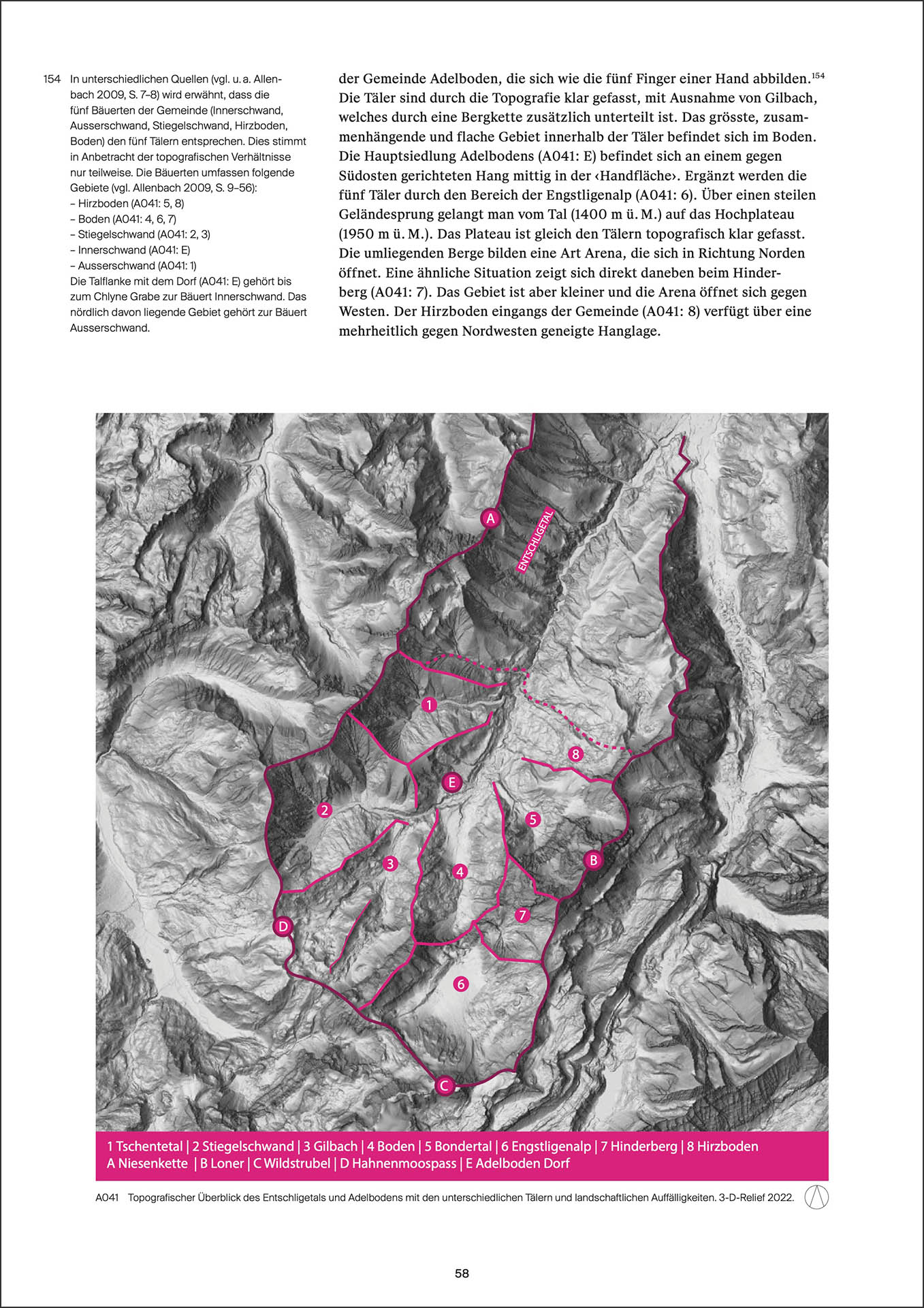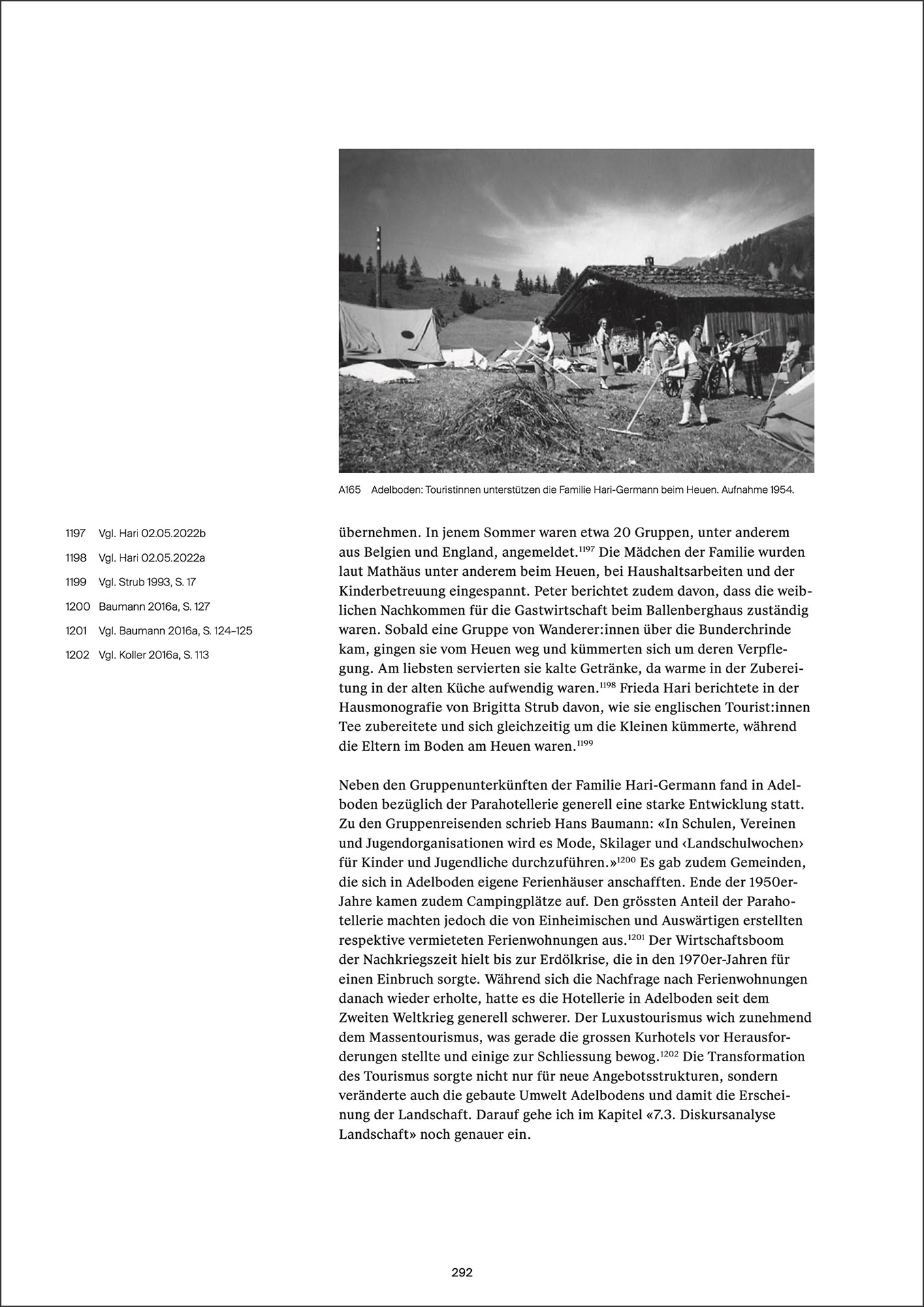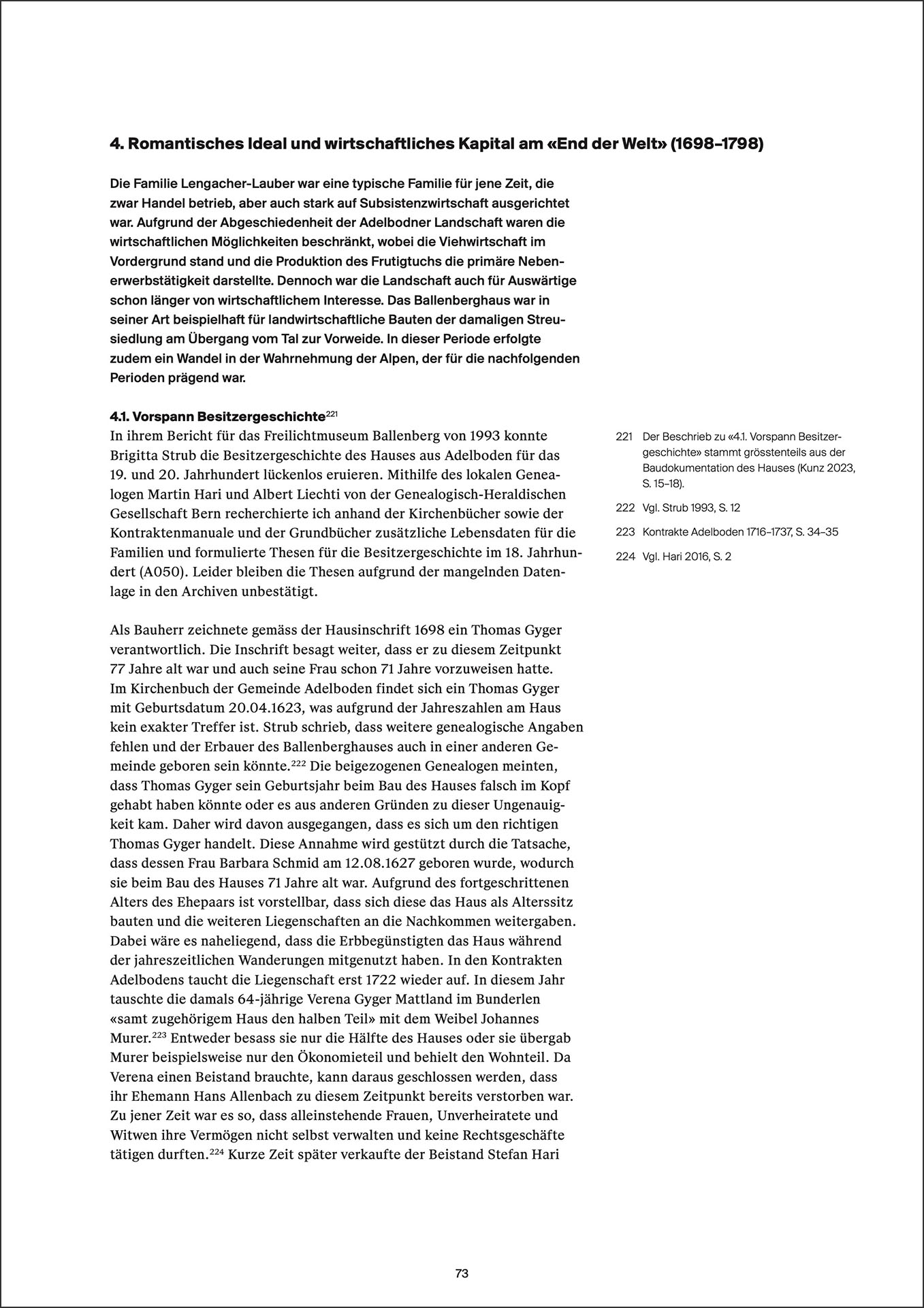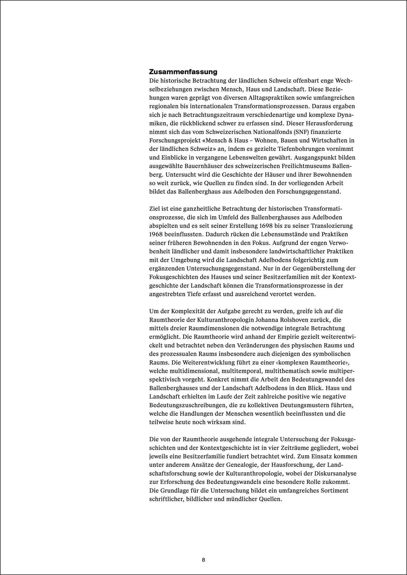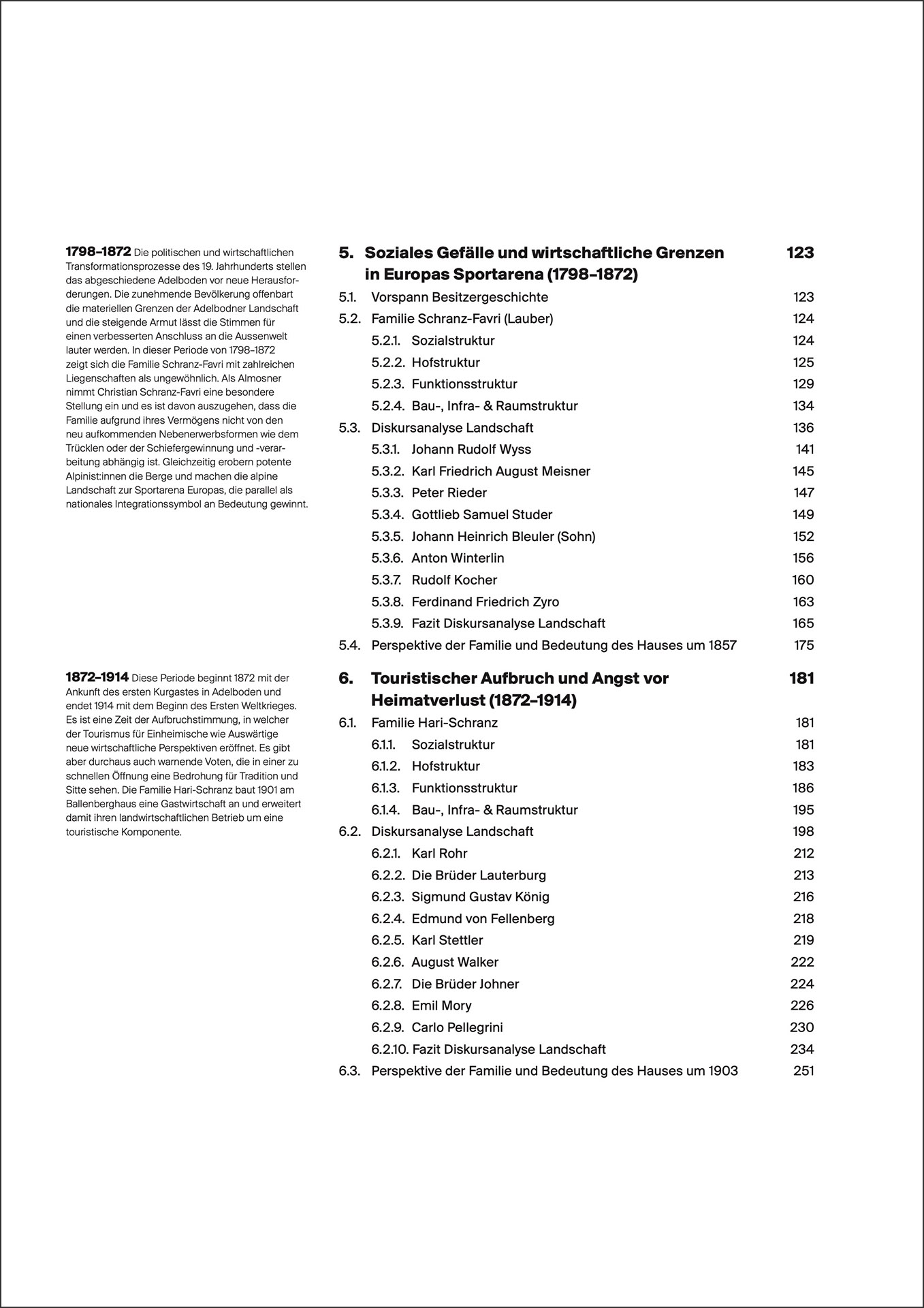 Stefan Kunz schildert diese vielfältigen Prozesse anhand der Landschaft in Adelboden. Er zeichnet die Lebenswelten der Menschen vor Ort in unterschiedlichen Zeiträumen nach, die vom Spannungsfeld zwischen bäuerlicher Tradition und touristischer Moderne geprägt waren. Die Kontextgeschichte der Landschaft setzt er dabei in Beziehung zu den Fokusgeschichten der Bewohnenden des Hauses, welches 1698 in Adelboden errichtet und 1968 ins Freilichtmuseum Ballenberg überführt wurde. Mithilfe eines raumtheoretischen Ansatzes untersucht er die Transformation des physischen, des prozessualen und des symbolischen Raums über eine Dauer von 270 Jahren. Dies ermöglicht vertiefte Einblicke in den historischen Diskurs und den Bedeutungswandel von Landschaft und Haus im alpinen Raum.