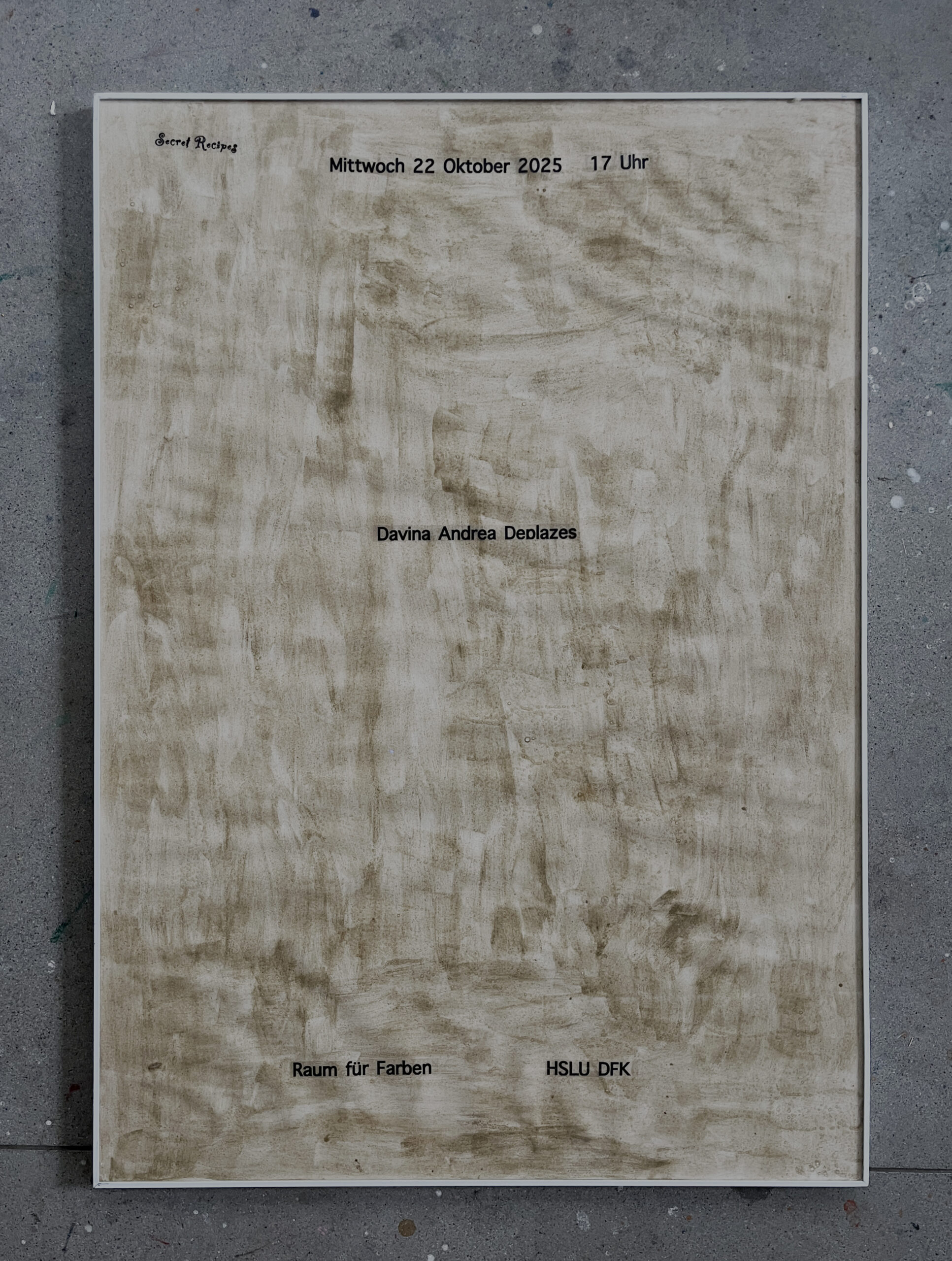Secret Recipes: Davina Andrea Deplazes ––––––––––––––––––––––––––––––––––––––––––––––––––––––––––––––––––––––––– Donnerstag 22. Oktober 2025, 17 Uhr ––––––––––––––––––––––––––––––––––––––––––––––––––––––––––––––––––––––––– Raum für Farben, HSLU DFK ––––––––––––––––––––––––––––––––––––––––––––––––––––––––––––––––––––––––– Secret Recipes ist eine Veranstaltungsreihe des Raums für Farben der HSLU DFK. In unregelmässigem Turnus lädt Secret Recipes Künstler:innen, Studierende, Dozierende und externe Interessierte zu Präsentationen, Gesprächen und informellem Austausch über Themen rund um das Material Farbe ein. ––––––––––––––––––––––––––––––––––––––––––––––––––––––––––––––––––––––––– Davina Andrea Deplazes (1999, lebt und arbeitet in Luzern) ist im rätoromanischen Dorf Surrein in der Surselva und im angrenzenden Val Sumvitg in Graubünden aufgewachsen. Ihre künstlerische Praxis umfasst Skulptur, Relief und Installation. Sie untersucht die Wechselwirkungen zwischen Materialität, Raum und Zeitlichkeit. Ihre Arbeit basiert auf einer dualen Erfahrung: der tiefen Verwurzelung in den archaischen Rhythmen eines Bergdorfes und der Dynamik urbaner Lebensräume. Zentral ist für sie in jeder Arbeit die Auseinandersetzung mit der kulturhistorischen Bedeutung von Werkstoffen und deren Bearbeitung. Gestein, Metalle, Gips, Glas und Holz verbinden sich in präziser und zugleich intuitiver Verarbeitung mit industriell schimmernden, teils täuschenden Oberflächen. Deplazes kombiniert traditionelle handwerkliche Techniken mit zeitgenössischen Fertigungsverfahren, um Gegensätze wie Härte und Weichheit, Natur und Industrie zu verknüpfen. Ihre Installationen erzeugen atmosphärische Dichte und verbinden unterschiedliche narrative Stofflichkeiten, die neue Perspektiven eröffnen, Kontraste vereinen und Raum als mannigfaltig geschichtetes Gefüge erfahrbar machen. Davina Andrea Deplazes studierte Spatial Design an der Hochschule Luzern, wo sie 2023 den Bachelor of Arts abschloss. Sie arbeitete sie als Assistentin der Künstlerin Victorine Müller und im Studio Raphael Hefti, sammelte mehrmonatige Erfahrungen im Berlin Glassworks Studio sowie in der Kunstgiesserei St. Gallen. 2023 gewann sie den Solo-Preis der Kunstgesellschaft Luzern, der ihr eine Einzelpräsentation während Zentral! 2024 ermöglichte. 2024 erhielt sie eine Förderung des Kantons Luzern im Rahmen der selektiven Förderprogramme für ein materialwissenschaftliches Rechercheprojekt und realisiert aktuell ihr erstes Kunst- und Bau-Projekt für den Erweiterungsbau des Schulhaus Steinhof in Luzern. Ihre Werke wurden in Institutionen wie dem Bündner Kunstmuseum, Kunstmuseum Luzern, ZAZ Bellerive – Zentrum Architektur Zürich sowie im Kunsthaus Zofingen gezeigt.